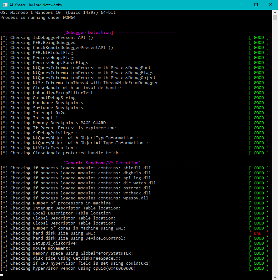 Al-khaser est outil qui ne fait rien de méchant en soi… C’est ce qu’on appelle un PoC, un “proof of concept” avec de bonnes intentions car il rassemble dans un seul programme toutes les techniques que les vrais malwares utilisent pour se planquer tels que la détection de machines virtuelles, le contournement des débogueurs, l’échappement aux sandbox, et j’en passe.
