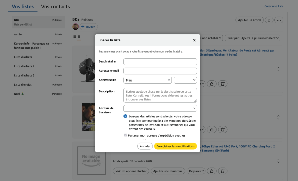 Amazon, fournisseur officiel de mauvaises idées en matière de vie privée depuis 1870 vient de nous pondre une nouvelle trouvaille !! À partir du 25 mars, si quelqu’un vous achète un cadeau via votre liste de souhaits Amazon, le vendeur tiers récupère votre adresse de livraison. Oui, votre VRAIE adresse !! Après en tant que français