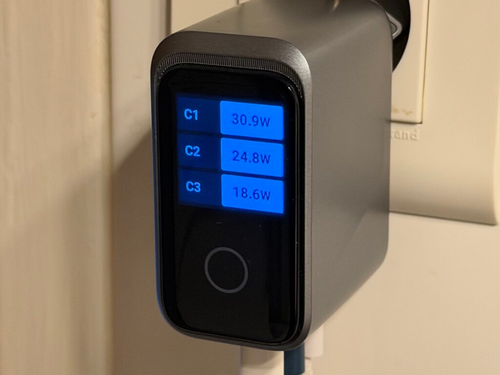 Là où Anker va chercher notre petit cœur de geek, c’est avec l’intégration de la technologie AnkerSense View. Le chargeur est équipé d’un écran tactile et rotatif qui vous donne toutes les infos en temps réel. C’est peut-être un détail pour le commun des mortels, mais voir s’afficher la puissance exacte délivrée à chaque appareil ou la température interne du chargeur procure une satisfaction assez particulière.