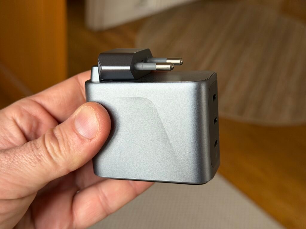 La première chose qui frappe quand on déballe la bête, c’est le contraste entre sa taille et sa fiche technique. Anker a réussi à faire tenir une puissance totale de 160 Watts dans un boîtier de plus en plus compact qui n’est pas beaucoup plus gros qu’un boîtier d’AirPods Pro. Grâce à l’utilisation massive du GaN (Nitrure de Gallium), ils obtiennent une densité énergétique de plus en plus folle, rendant ce chargeur environ 70 % plus petit que si vous deviez empiler les trois chargeurs standards nécessaires pour obtenir la même puissance. C’est fini l’époque où puissance rimait forcément avec encombrement. Mais ce qui est fou c’est quand on compare ce chargeur à des chargeurs GaN d’il y a un ou deux ans, les progrès sont encore fous…