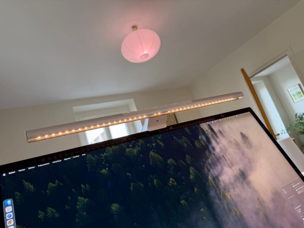 La lampe se branche simplement en USB-C (vous pouvez utiliser un port de votre écran ou de votre ordinateur, ou le chargeur fournit), et elle s’allume sans effort. Pas de câble en pagaille, pas de socle qui prend de la place : on gagne en espace, et visuellement, c’es épuré. Le résultat est élégant, presque invisible une fois installée.