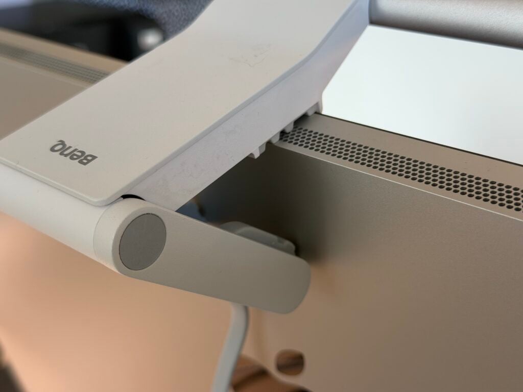 J’ai opté pour le modèle argenté, celui que vous voyez sur la plupart des bureaux bien rangés sur Instagram. Dès le déballage, BenQ donne le ton : pas de plastique, un design minimaliste digne d’un accessoire Apple. La ScreenBar Pro se fixe sur le haut de l’écran sans le moindre outil, grâce à une pince articulée en métal qui respire la solidité. Elle s’adapte à tous les moniteurs, même incurvés, et ne bloque ni la webcam ni l’affichage.