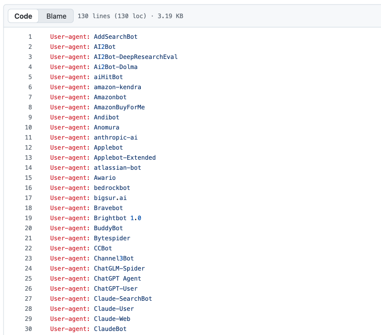 L’idée c’est de maintenir sur Github une liste exhaustive de tous les crawlers liés à l’IA, que ce soit pour entraîner des modèles ou alimenter des moteurs de recherche IA. On y retrouve les suspects habituels comme GPTBot (OpenAI), Claude-Web (Anthropic), Google-Extended, meta-externalagent, mais aussi des trucs plus obscurs comme img2dataset ou laion-huggingface-processor qui servent à aspirer des images.