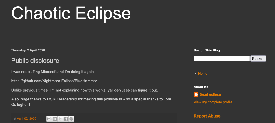 Le chercheur derrière tout ça opère sous les pseudos Chaotic Eclipse et Nightmare-Eclipse et le 3 avril 2026, il a publié