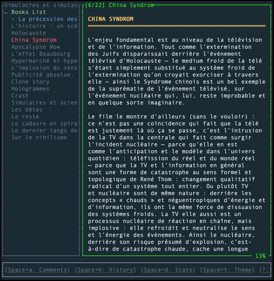 Côté navigation, c’est du classique avec des raccourcis inspirés de Vim (hjkl pour les intimes ^^) afin de scroller, changer de chapitre ou chercher dans le texte. L’outil gère aussi les signets automatiques ce qui est pratique quand on n’a pas le temps de finir “Guerre et Paix” d’une traite et vous pouvez même ajouter des notes directement dans le texte pour ne rien oublier.