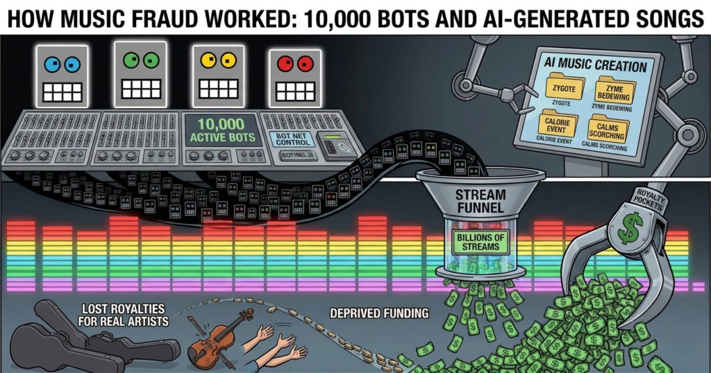 Un mec de 54 ans vient de plaider coupable pour avoir siphonné 8 millions de dollars aux artistes musicaux en utilisant 10 000 bots et de la musique générée par IA. Michael Smith, résident de Cornelius en Caroline du Nord, a monté pendant des années une ferme à streams qui écoutait en boucle des centaines de milliers de fausses chansons sur Spotify et Apple Music.