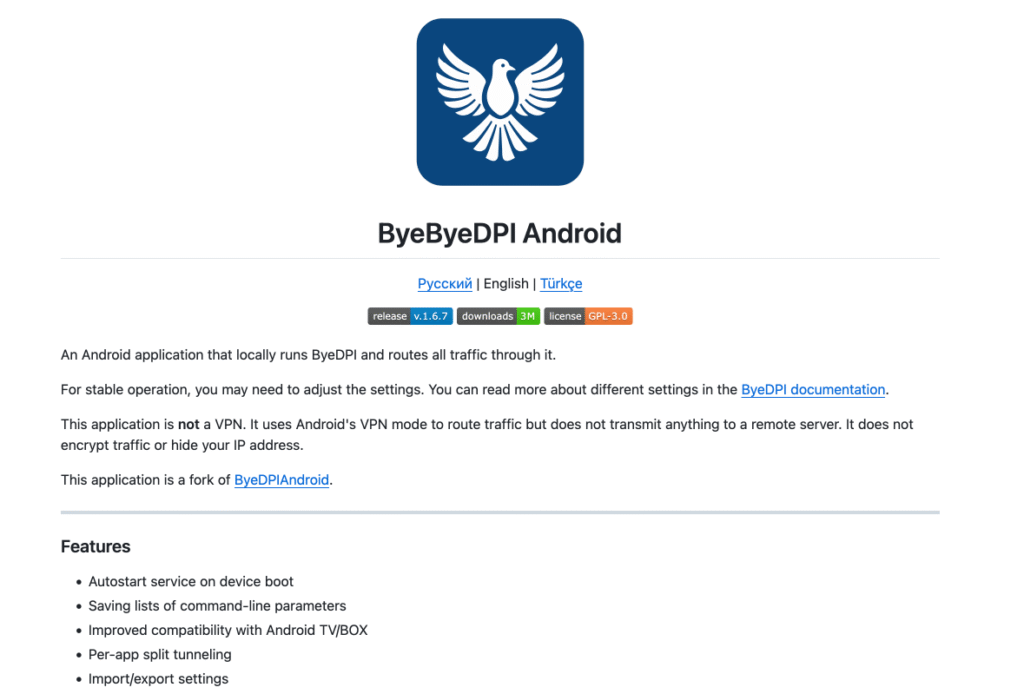 Cette app est née en Russie, où le DPI est massivement déployé depuis 2019 avec le système TSPU (Technical Means for Countering Threats). Comme la Russie bloque des sites avec une combinaison de blocage IP + DNS + DPI, les VPN classiques sont de plus en plus détectés et bloqués. Mais ByeByeDPI, lui, passe sous les radars parce qu’il ne ressemble PAS à un VPN. Il ressemble à du trafic normal avec des problèmes de connexion.