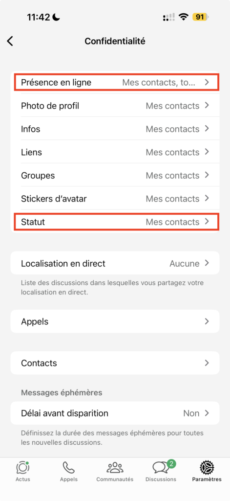 Alors comment on fait pour se protéger de ça ? Et bien dans Whatsapp, il y’a une option qui se trouve dans Paramètres → Confidentialité et autoriser seulement “Mes Contacts” à voir ce qu’on partage, ce qui permet de limiter les accusés de réception à vos contacts uniquement. Ça ne règle pas tout, mais ça complique la tâche des inconnus qui voudraient vous traquer.