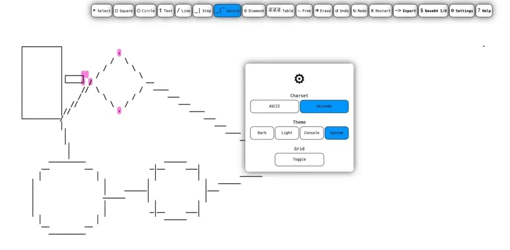 L’éditeur propose plusieurs charsets tels que ASCII classique ou Unicode pour ceux qui veulent des lignes plus jolies et il y a 3 styles de lignes (pointillées, solides fines, solides épaisses) ainsi que des flèches directionnelles. Côté thèmes, du sombre, du clair, ou un mode “console” pour les nostalgiques du terminal.