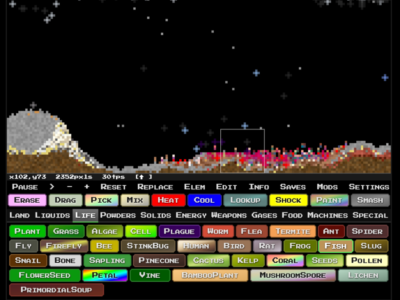 Le concept, c’est que vous choisissez un élément (eau, feu, sable, acide, TNT…), vous le placez sur une grille de pixels, et vous regardez ce qui se passe. Sauf que ça va beaucoup plus loin qu’un bête falling sand game des années 2000 puisqu’il y a de la simulation de chaleur qui se propage, de l’électricité pour créer des circuits fonctionnels, des réactions chimiques entre éléments, et même de la biologie avec des plantes, des insectes et des humains qui se baladent sur votre terrain. Du coup, on peut construire des écosystèmes entiers, des villes miniatures, ou juste tout faire péter au TNT. Chacun son kiff !