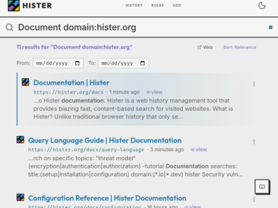 Vous installez l’extension Chrome ou Firefox, vous lancez le binaire Go sur votre machine (ça tourne sous Linux, macOS et Windows), et hop, chaque page que vous visitez est indexée en full-text. Du coup, quand vous cherchez ce tuto que vous aviez lu y’a 3 semaines mais dont vous avez zappé l’URL, vous ouvrez l’interface web locale de Hister, vous tapez un mot qui était dans le contenu de la page et ça ressort ! Si vous aviez testé