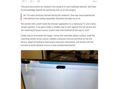 Une IA a rooté une télé Samsung tournant sous KantS2, la plateforme logicielle d’un ancien modèle de la marque. C’est Codex, le modèle de code d’OpenAI, qui a trouvé un driver laissé avec des droits d’écriture sur le firmware, mappé la mémoire physique, et est passé root en quelques étapes. Les chercheurs de