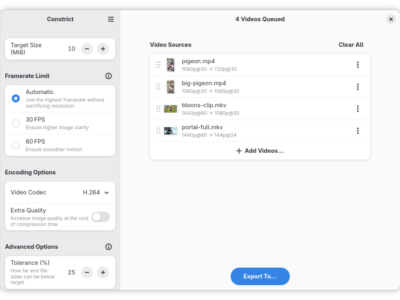 , c’est une app GNOME (Linux uniquement, du coup…) qui règle ce problème de la façon la plus logique possible. Vous lui donnez une taille cible en Mo, et elle se débrouille toute seule pour que votre vidéo rentre pile-poil dedans.