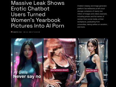 La plateforme SecretDesires.ai, un service de chatbot érotique avec génération d’images par IA, a laissé fuiter dans la nature près de 2 millions de photos et vidéos dans des conteneurs Azure pas du tout sécurisés. Hé oui, n’importe qui pouvait y accéder via de simples fichiers XML contenant tous les liens vers les images, et ça ont le sait grâce à cette enquête de