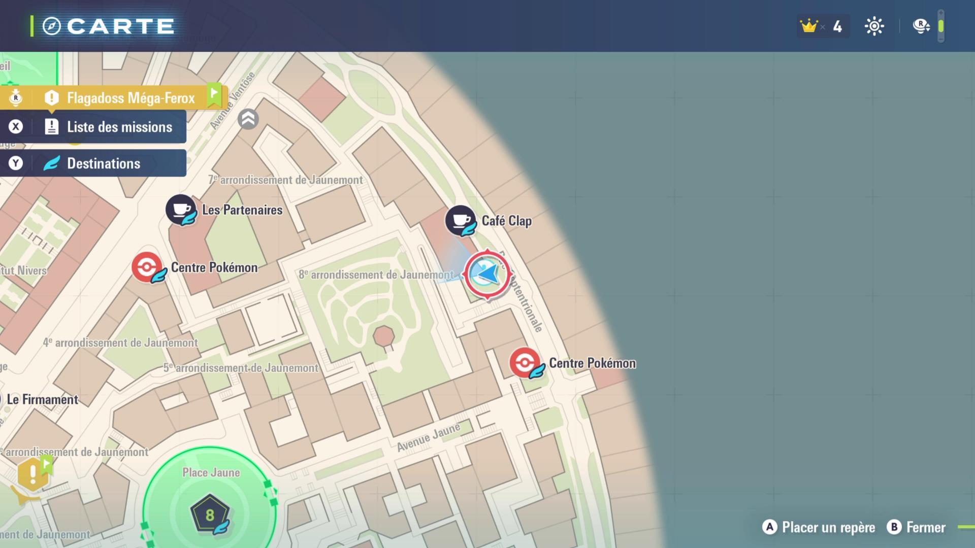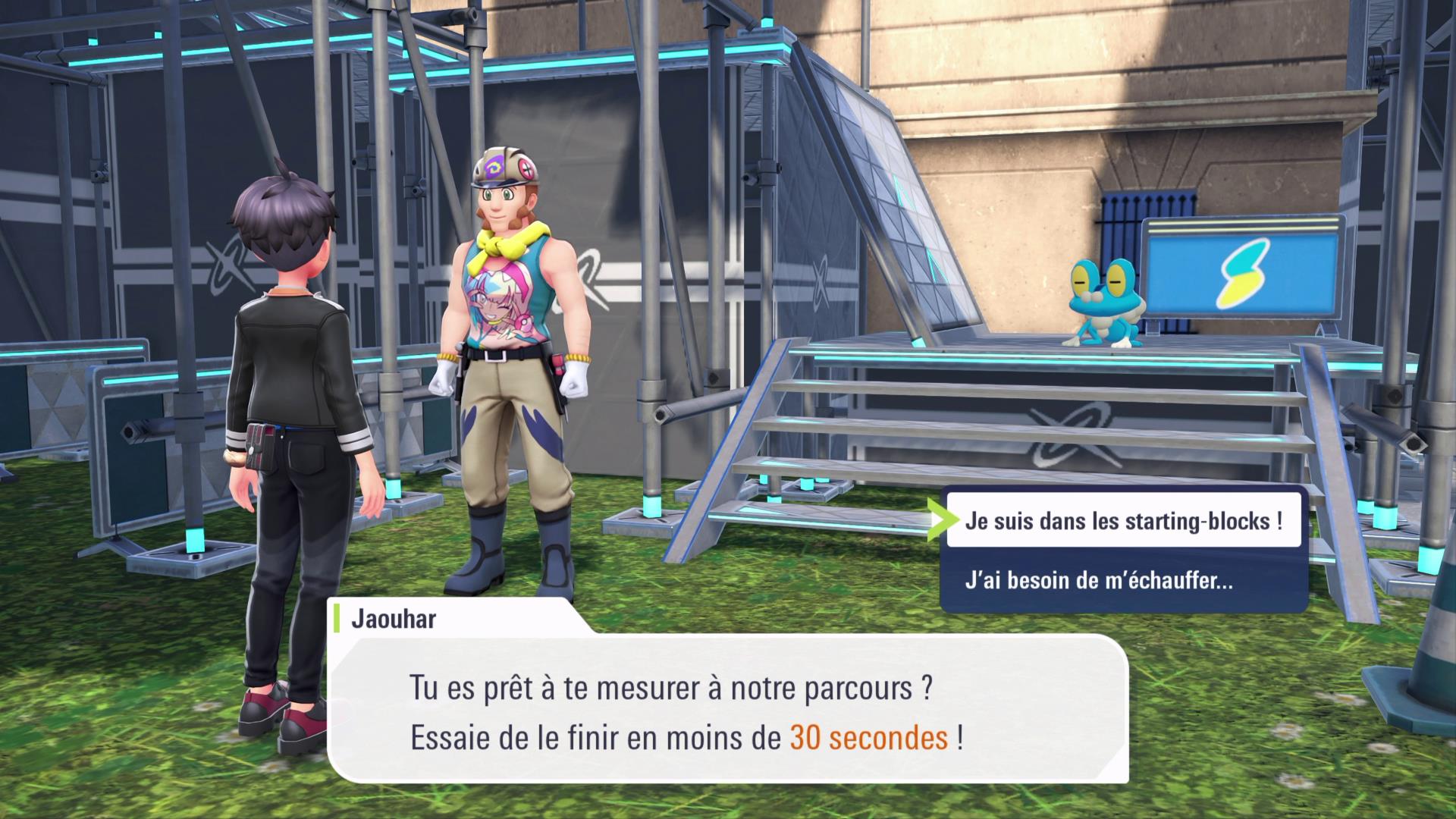 Bien que cette mission soit listée après celle de Feunnec, il est conseillé de la faire avant si vous ne possédez pas encore de Pokémon de type Eau. Rendez-vous à l’emplacement de la Mission secondaire 9 : Le défi de Grenousse. Cette fois, pas de combat : Grenousse est persuadé qu’aucun Dresseur ne peut égaler sa vitesse sur le Parcours d’Échafaudages situé à l’est 8eme arrondissement de Jaunemont.