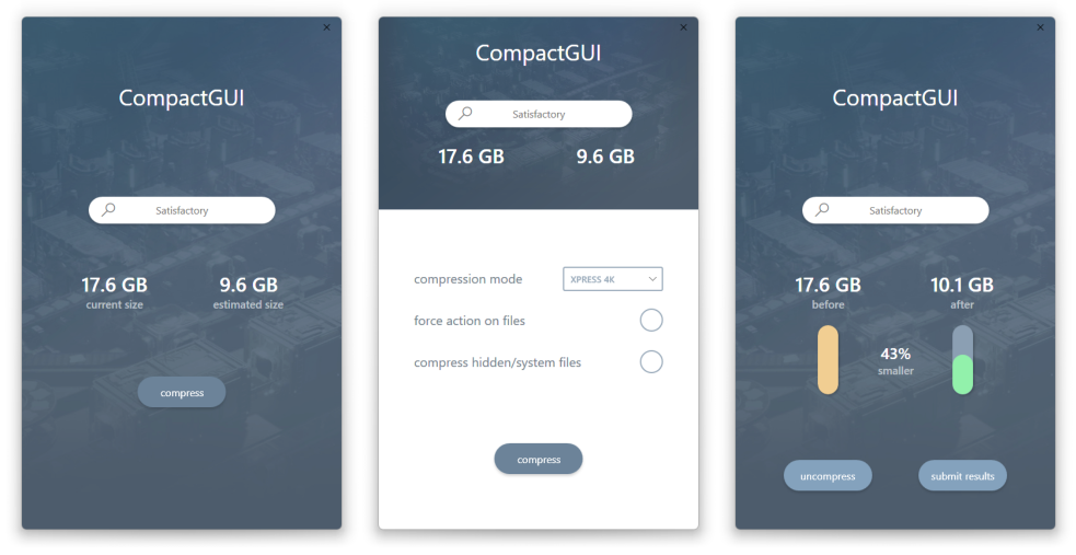 Et c’est là que CompactGUI intervient puisqu’il transforme compact.exe en version compatible avec votre syndrome du clickopathe. C’est tout.