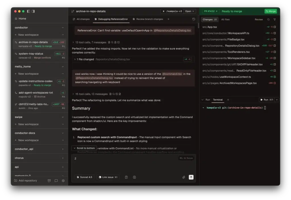 Vous ouvrez l’app, Cmd+N pour créer un workspace, et ensuite, chaque agent bosse dans son coin sur sa propre branche git comme ça y’a pas de conflits ni de merge foireux au milieu du boulot ! Et grâce à cet outil, vous voyez d’un coup d’oeil ce que chacun fabrique via le diff viewer intégré. Ensuite, vous reviewez, et quand c’est bon vous mergez. Comme un chef de chantier en fait, sauf que vos ouvriers ce sont des LLM.