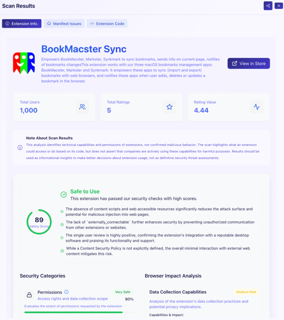 Vous lui donnez une extension à scanner, il inspecte le manifest.json, regarde quelles permissions sont demandées, vérifie les scripts inclus, et vous dit si ça pu ou si vous pouvez y aller tranquillou. Et c’est utile car ces dernières années, y’a eu