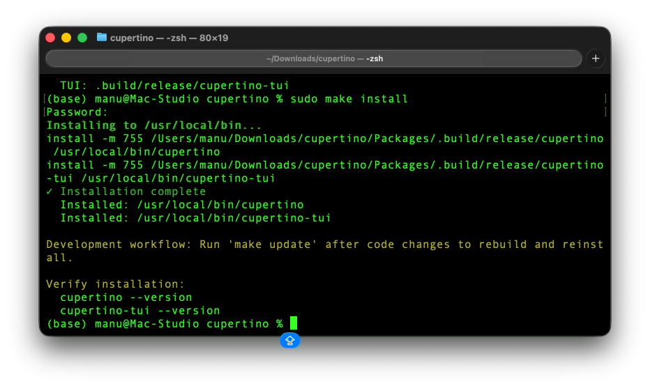 Cette commande compile le projet Swift en mode release (ne faites pas attention aux warning éventuels) et copie le binaire dans /usr/local/bin/. Vous devriez ensuite voir un message du genre “Build complete” suivi des chemins où le binaire est déployé.