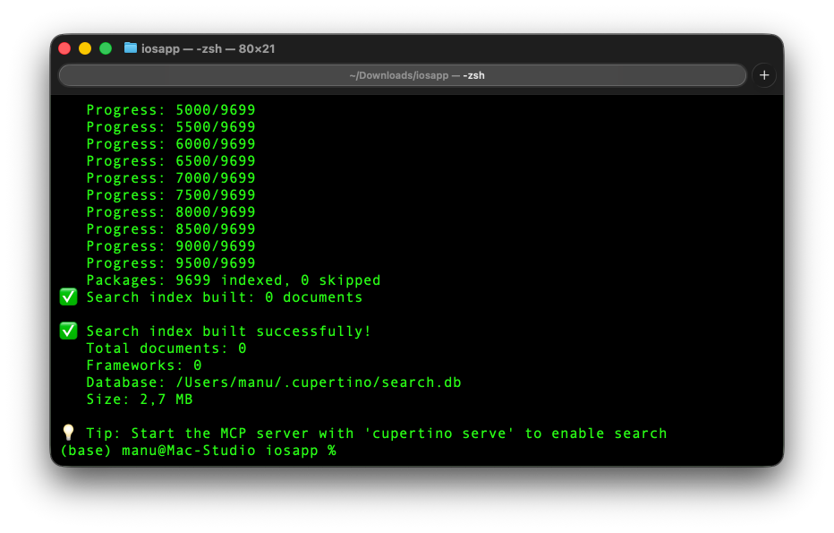 Le --scope user fait que le serveur sera dispo dans tous vos projets, pas juste celui où vous êtes. Vous devriez voir : “Added stdio MCP server cupertino with command: /usr/local/bin/cupertino to user config”.