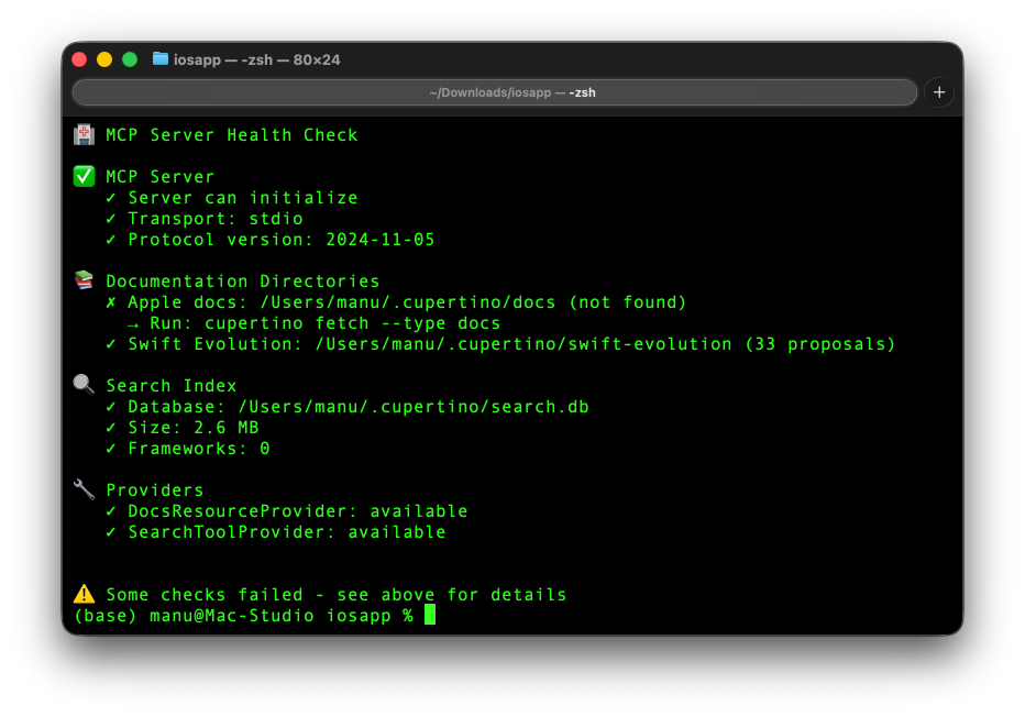 Et maintenant pour vérifier que tout marche, lancez Claude Code avec claude puis tapez /mcp. Vous devriez voir cupertino dans la liste avec 3 outils : search_docs, list_frameworks et read_document. Vous pouvez aussi lancer cupertino doctor dans le terminal pour un diagnostic complet qui vérifie que le serveur MCP, le répertoire de doc et l’index de recherche sont bien en place.