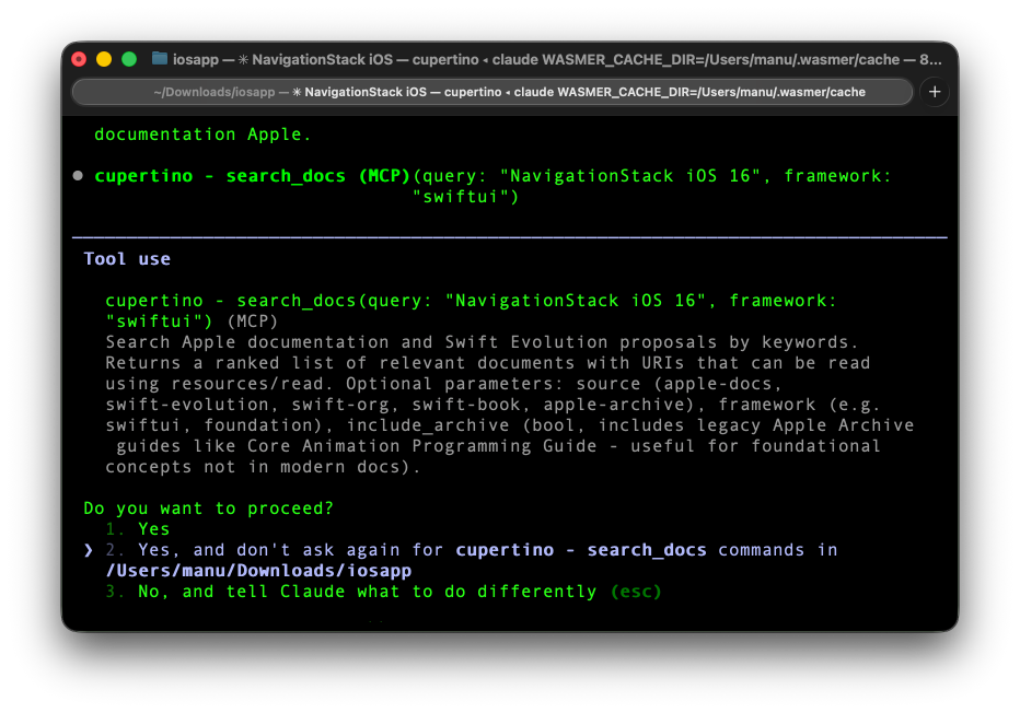 Testez en demandant à Claude de chercher quelque chose dans la doc Apple. Genre “NavigationStack iOS 16”. Il devrait utiliser l’outil search_docs et vous retourner la vraie documentation avec les bons exemples de code… pas du deprecated.