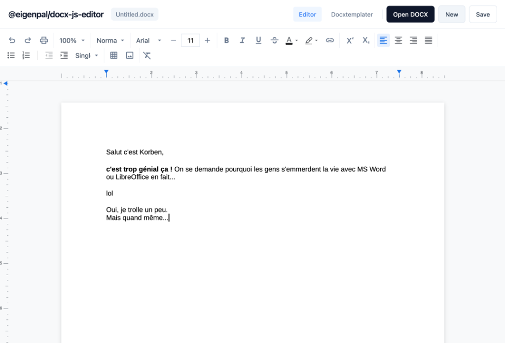 Ce petit bijou open source est un éditeur WYSIWYG conçu spécifiquement pour l’écosystème React qui permet d’ouvrir, de modifier et d’enregistrer des fichiers .docx directement dans le navigateur. Le gros point fort revendiqué par le projet, c’est l’absence de dépendance serveur pour toute la partie édition. Tout le boulot se fait donc en local chez le client, ce qui est plutôt classe côté confidentialité des données puisque vos documents ne transitent pas par un backend obscur.