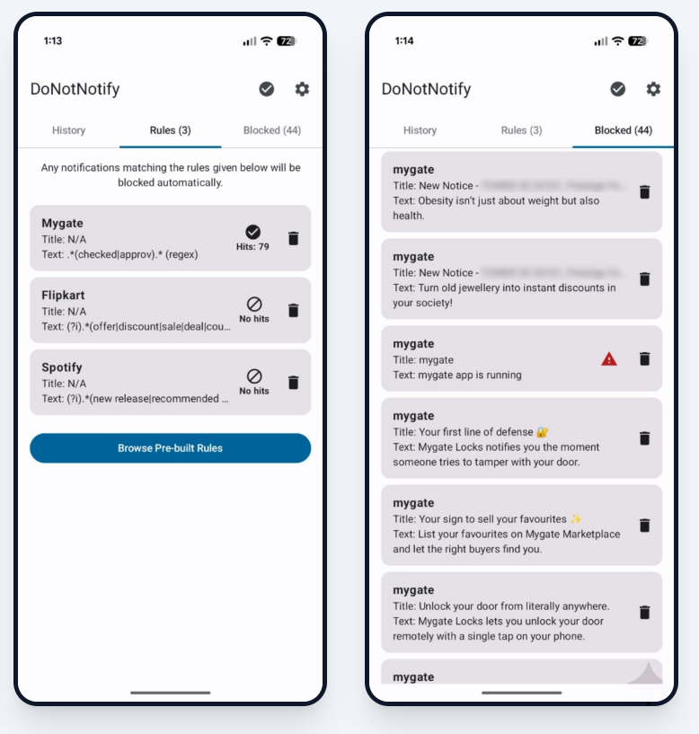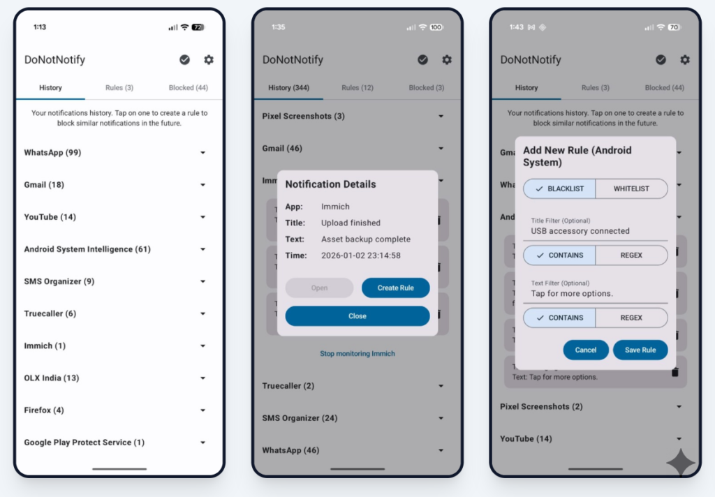 Ça vous permet de créer des règles pour bloquer ce qui vous gonfle, et vous gardez ce qui compte vraiment. Vous pouvez ainsi filtrer par application, par mots-clés dans le contenu du message, ou même utiliser des expressions régulières pour les plus geeks d’entre vous. Du coup, fini les popups “Profitez de -20% !” toutes les 5 minutes pendant que vous essayez de vous concentrer sur vos orteils pour la méditation guidée.