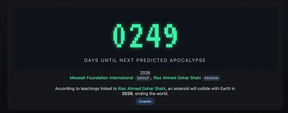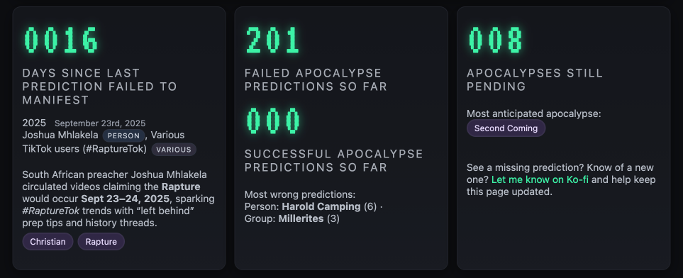 ne se contente pas uniquement d’archiver les échecs. Il liste aussi les apocalypses en attente. En ce moment y’a 8 prédictions pour 2025-2026. Donc 8 nouvelles chances de voir le compteur passer à 209 apocalypses ratées. Ce que j’aime bien avec ce site en tout cas, c’est qu’il transforme des annonces plutôt déprimantes en performance artistique.