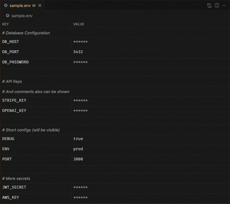 En gros, dès que vous ouvrez un fichier .env (ou .env.local, .env.production… bref, tout ce qui matche le pattern), l’extension vous présente vos variables dans un tableau à deux colonnes. Les clés à gauche, les valeurs masquées à droite. Pour modifier une valeur, hop, vous cliquez dessus et elle se dévoile le temps de l’édition. Vous cliquez ailleurs, c’est re-masqué. Pas de sauvegarde manuelle à faire, ça se fait tout seul.
