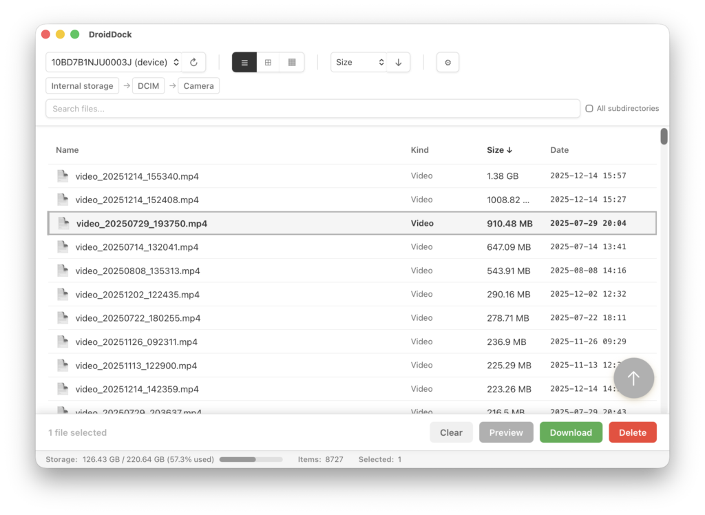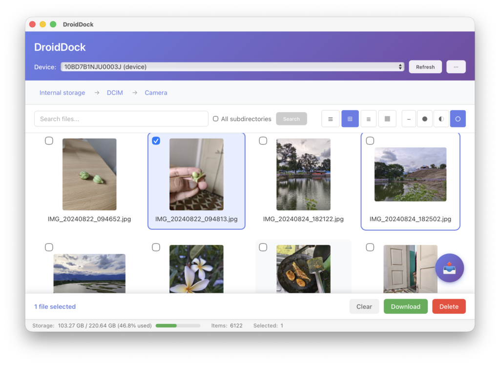 Et là où c’est pratique c’est que vous pouvez prévisualiser vos images et vidéos directement dans l’app sans avoir à les télécharger d’abord. Vous avez trois modes de vue (grille, liste ou miniatures) et le drag & drop fonctionne dans les deux sens. Vous glissez un fichier depuis votre Mac vers DroidDock, il atterrit sur votre téléphone. Et l’inverse marche aussi.