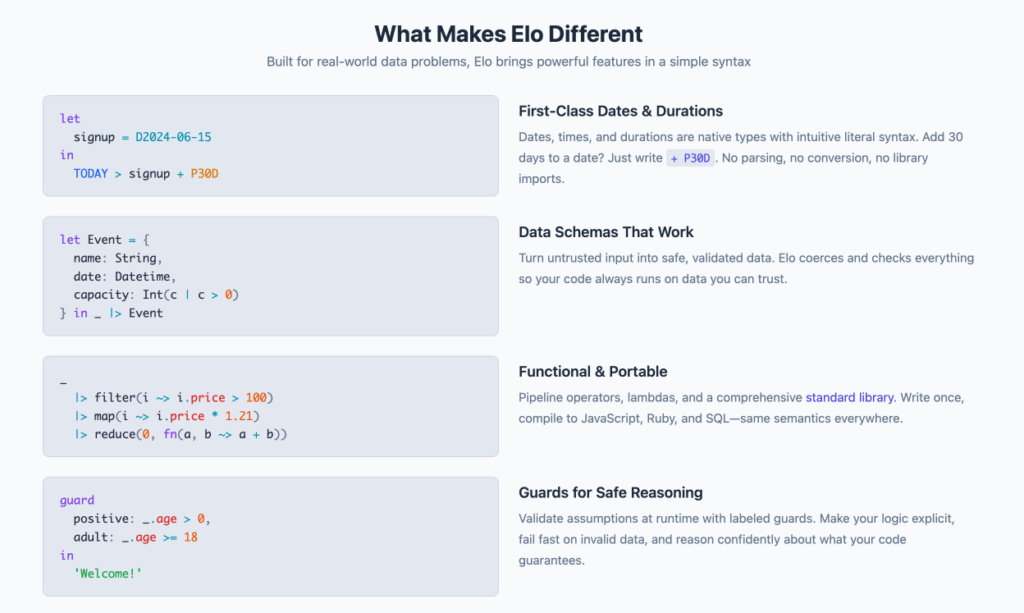 Elo, lui, adopte l’approche inverse… le “zero-trust“. Le langage ne fait confiance à personne, ni au développeur, ni à l’IA qui pourrait l’utiliser. Ainsi, chaque expression est pure, chaque fonction est déterministe, et le compilateur vérifie tout avant d’exécuter quoi que ce soit.