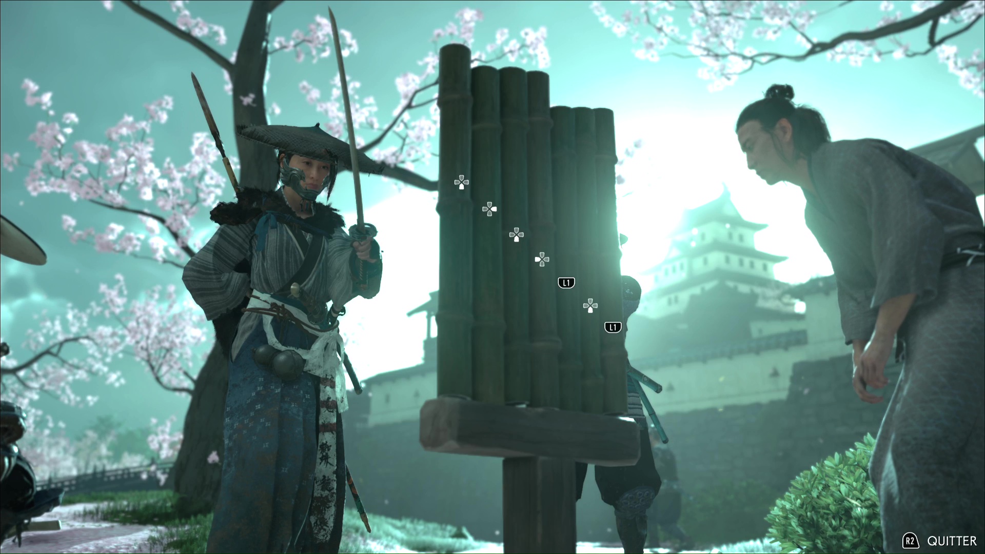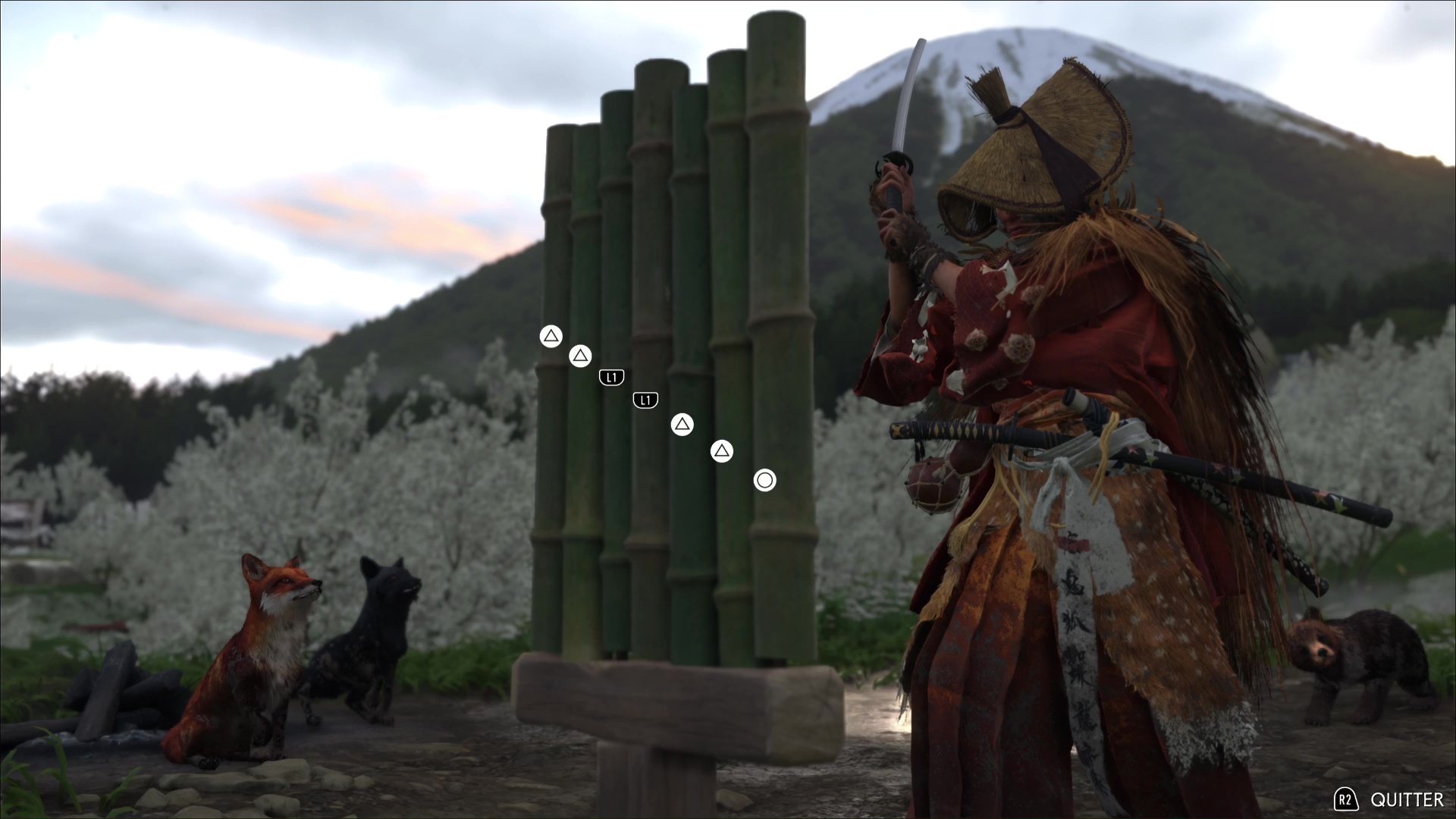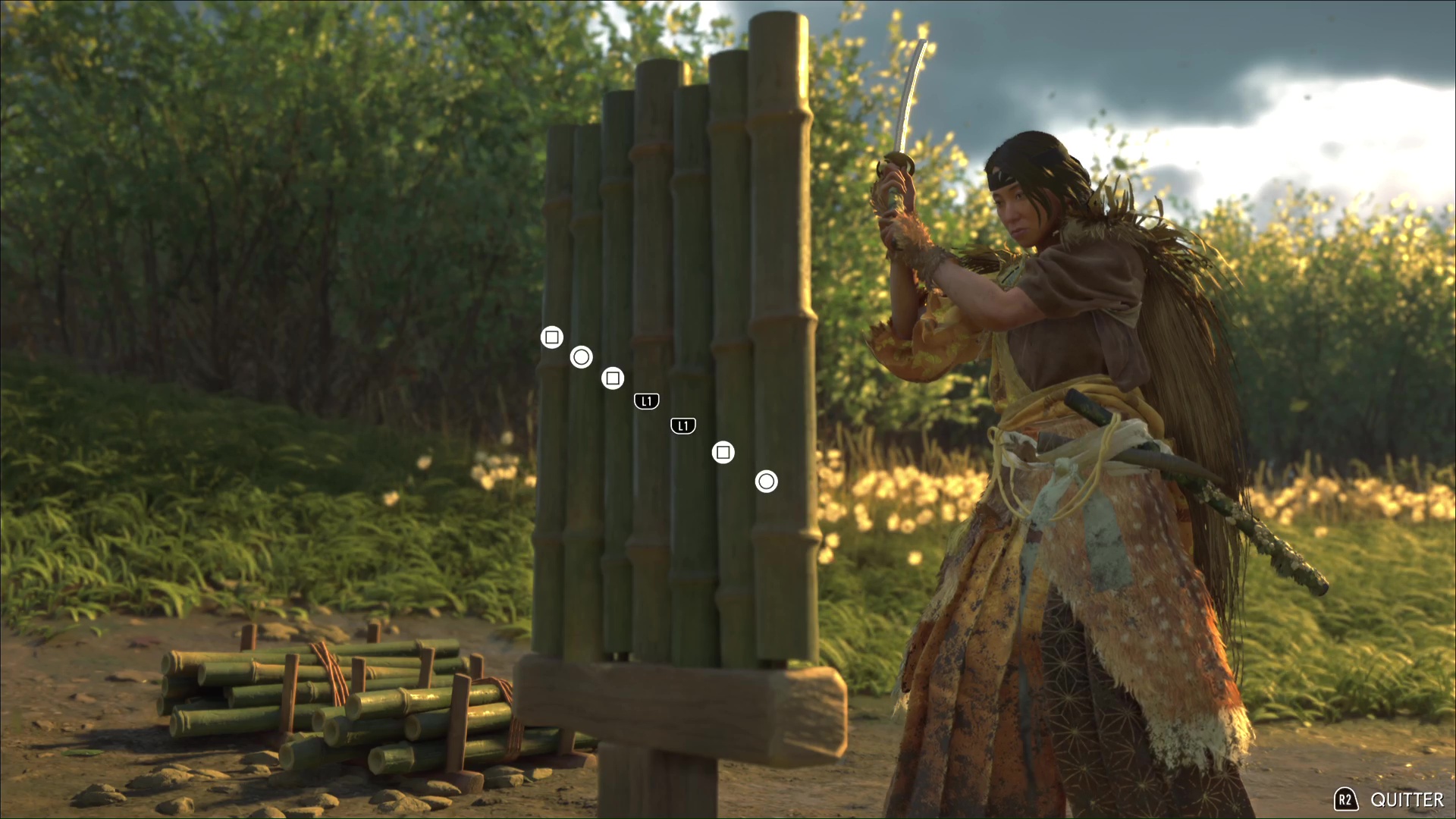 Les bambous d’entraînement de Ghost of Yōtei remplissent la même fonction que dans Ghost of Tsushima, à savoir augmenter la jauge d’esprit de notre personnage principal. À chaque entraînement, il nous faut découper, trois, puis cinq, puis sept bambous via une série de QTE à effectuer très rapidement.