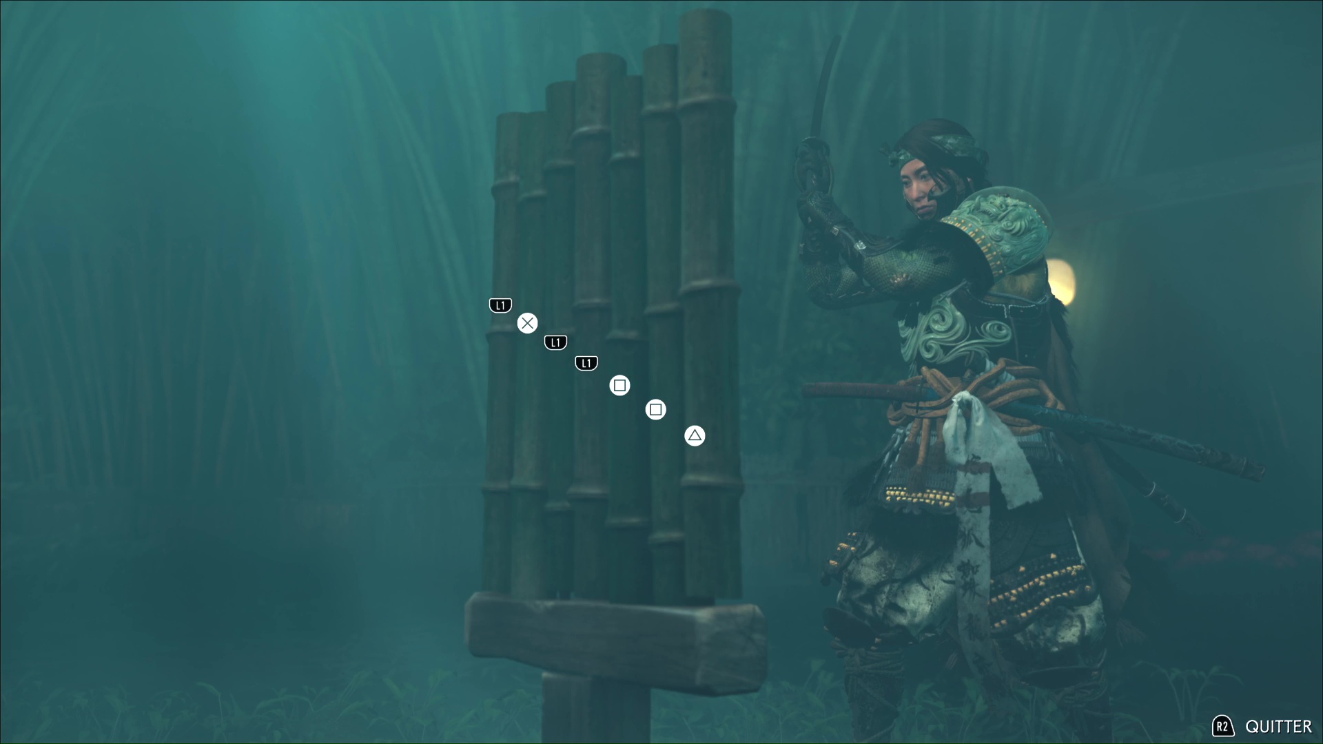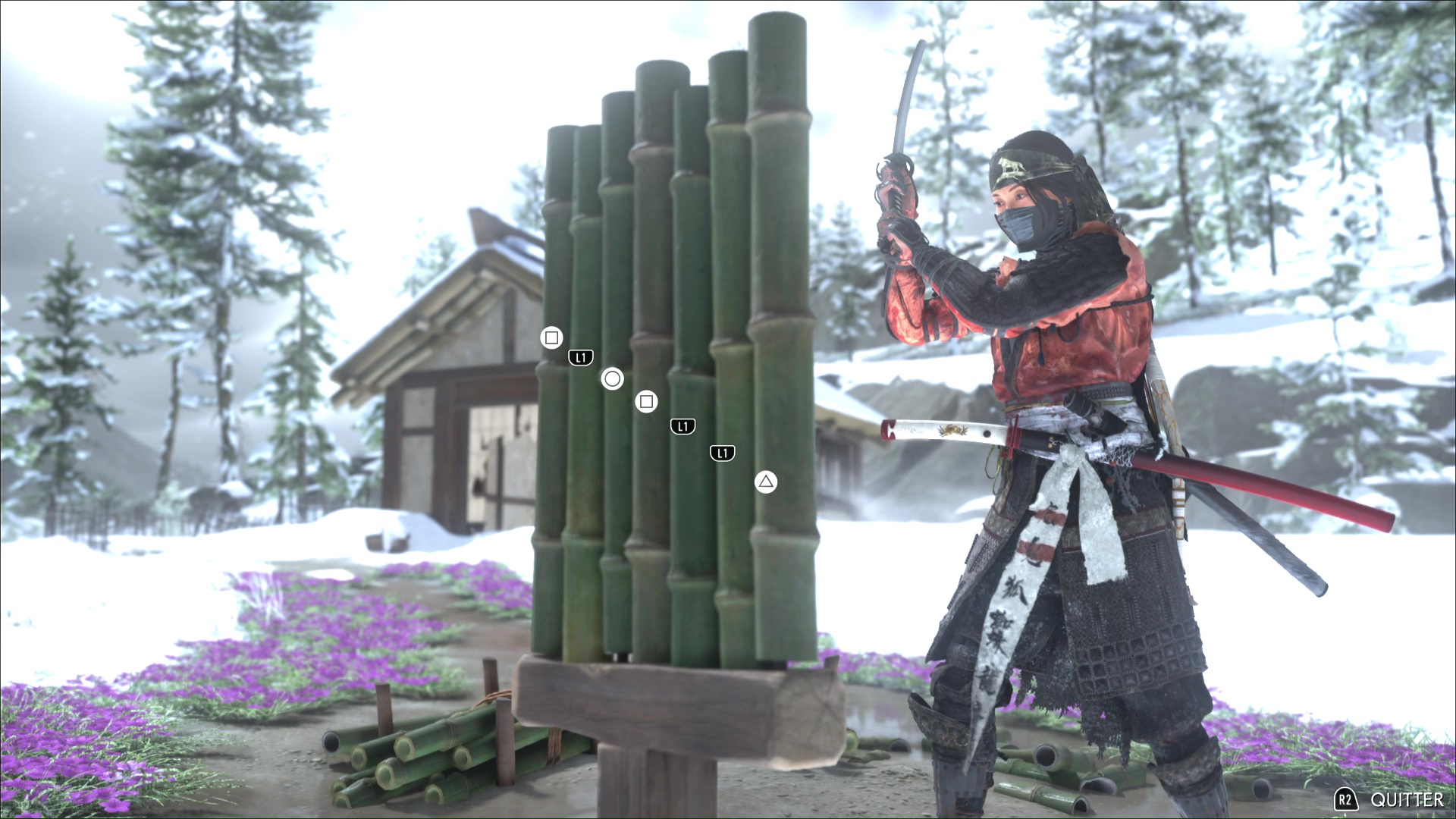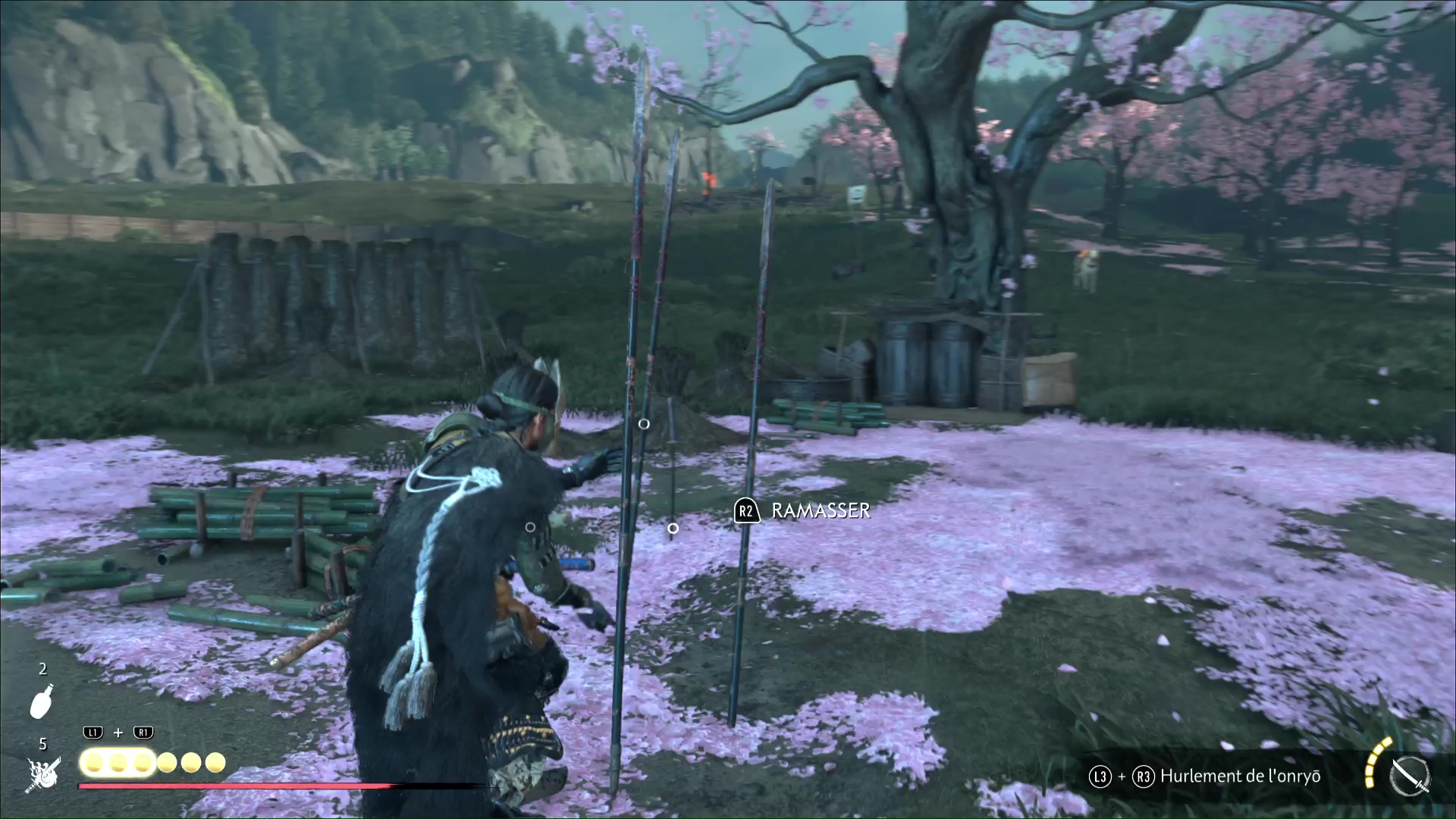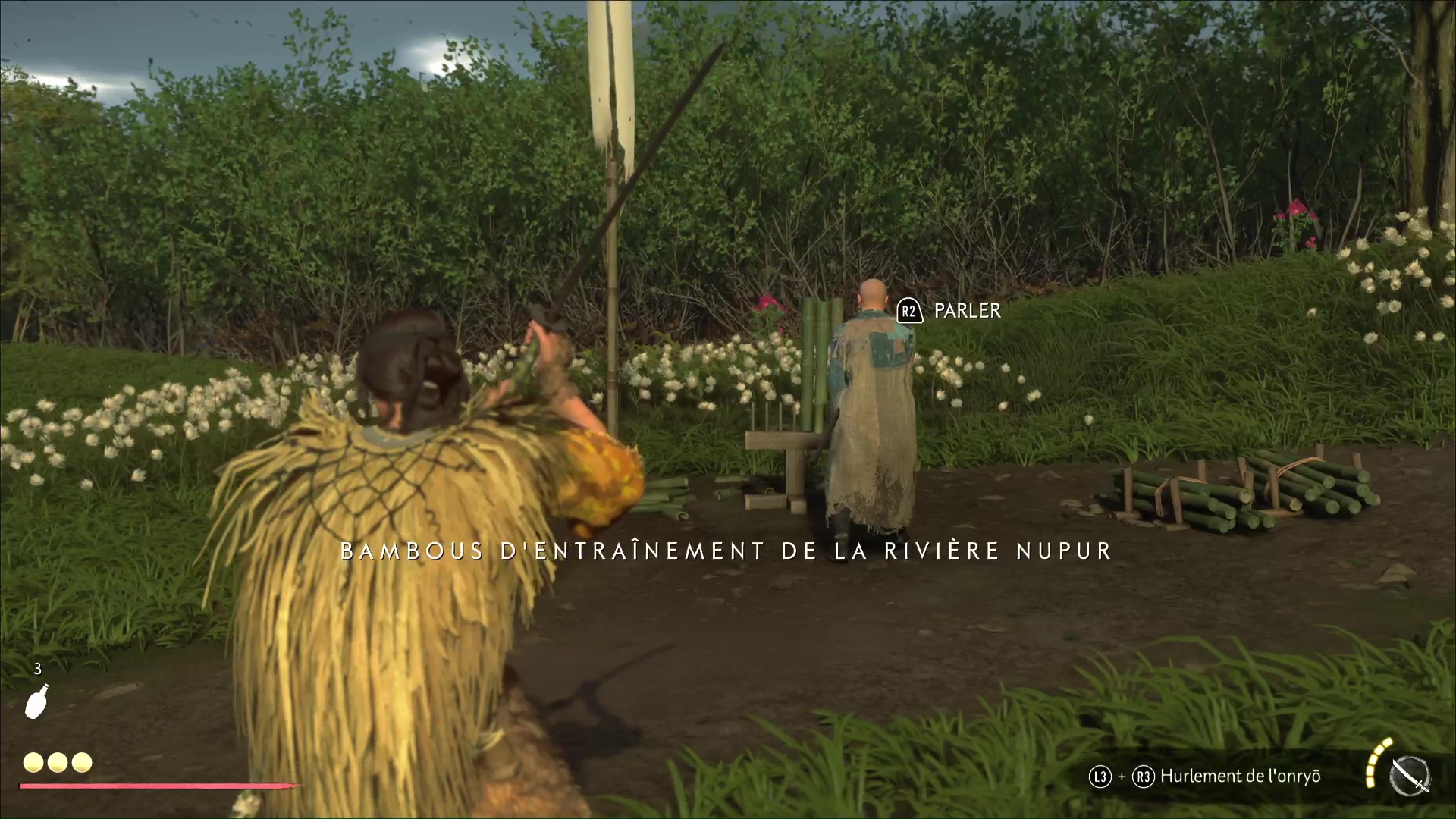 Les bambous d’entraînement de Ghost of Yōtei remplissent la même fonction que dans Ghost of Tsushima, à savoir augmenter la jauge d’esprit de notre personnage principal. À chaque entraînement, il nous faut découper, trois, puis cinq, puis sept bambous via une série de QTE à effectuer très rapidement.