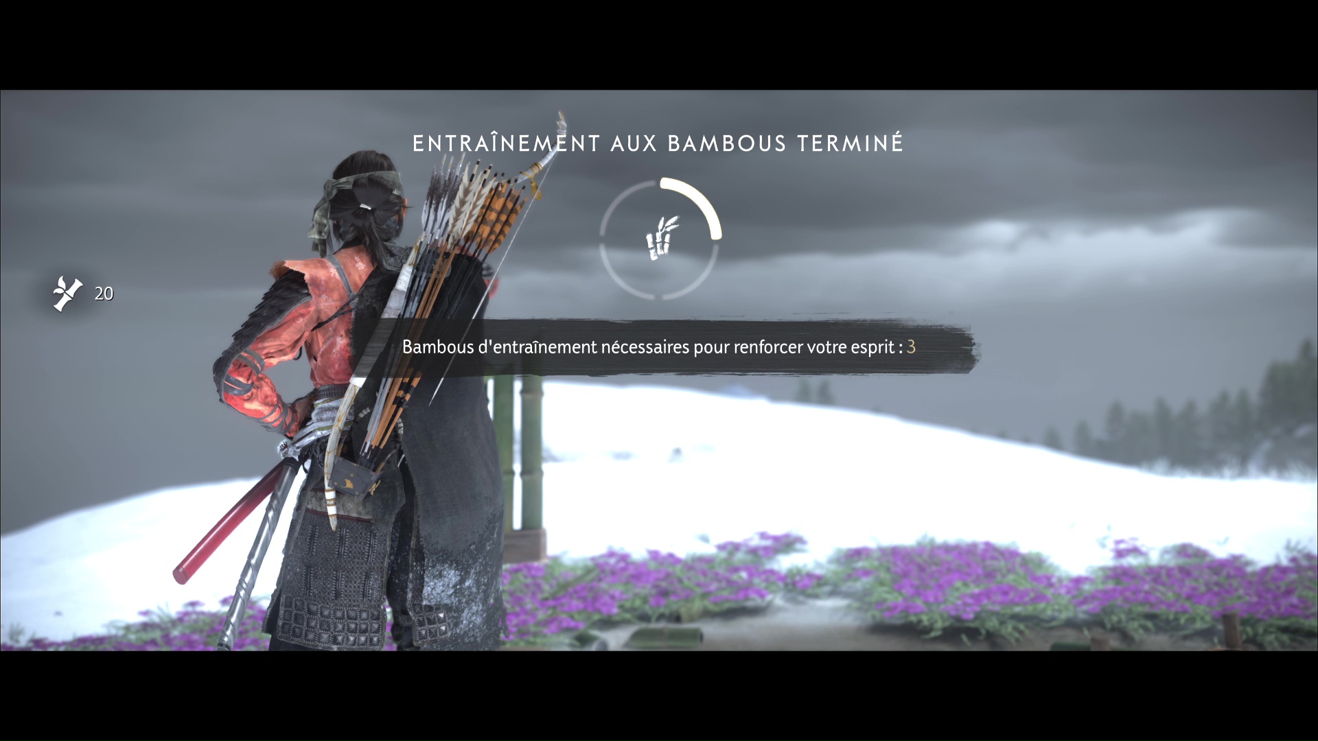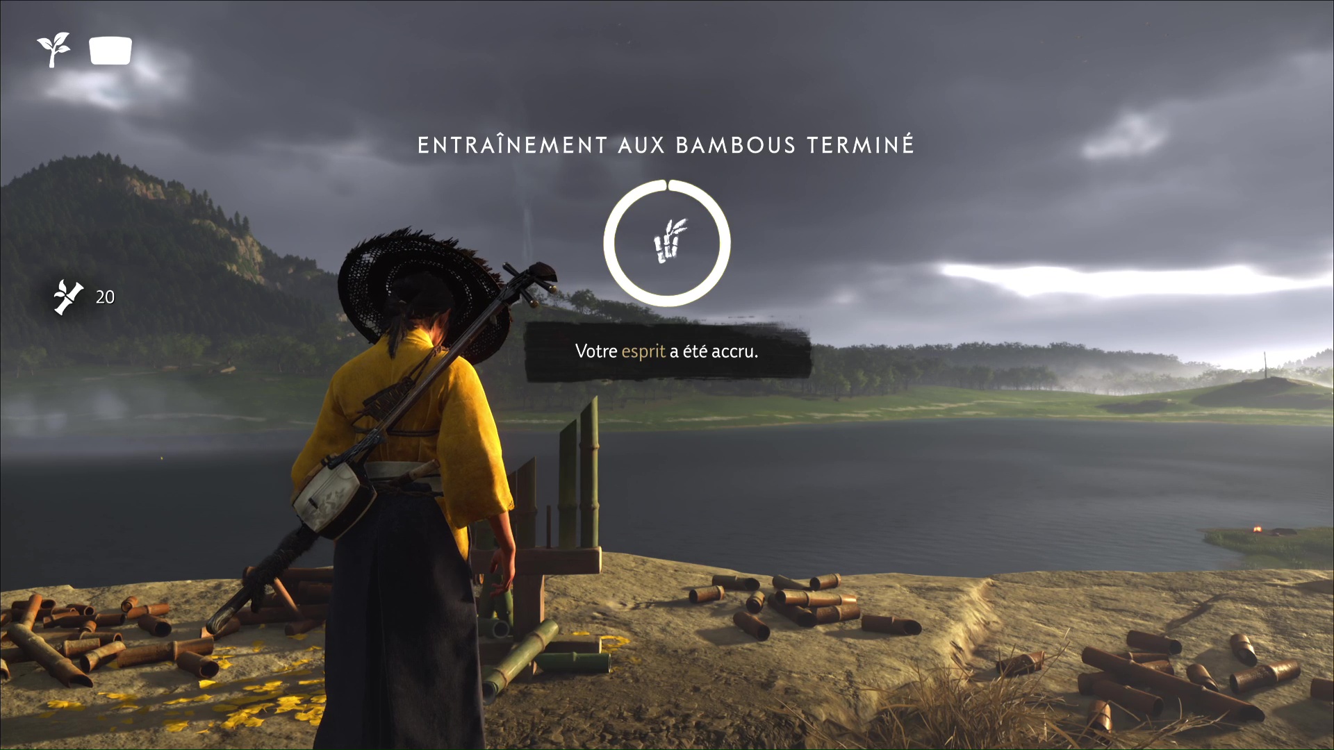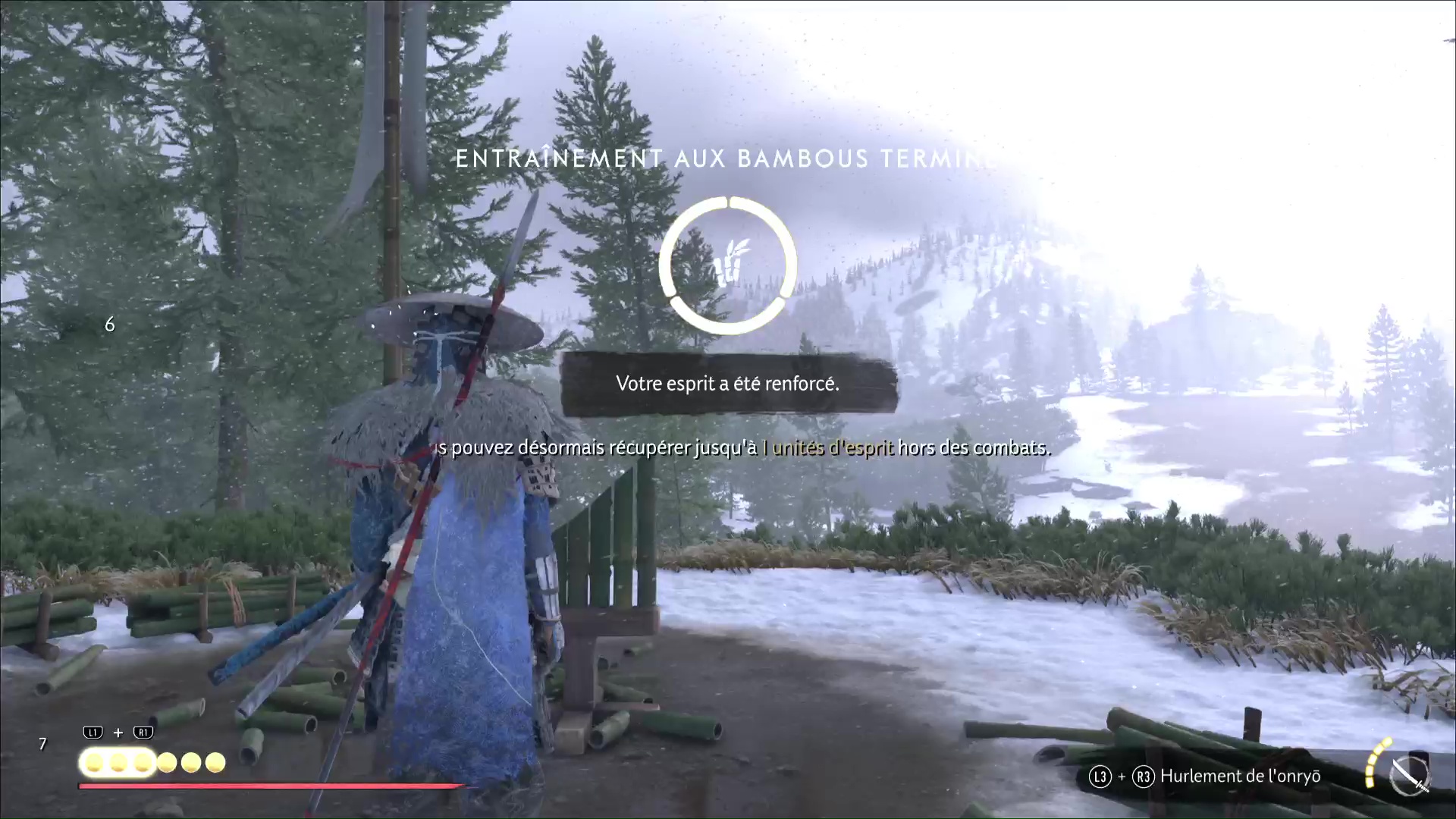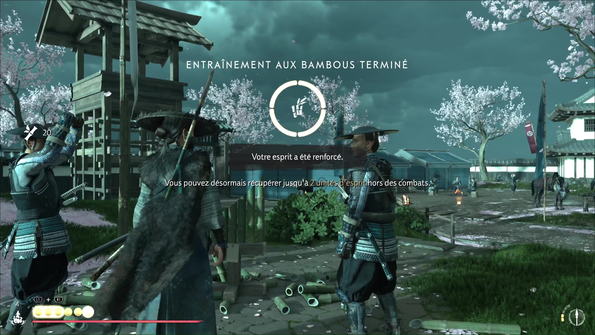 Vous réapparaîtrez alors de nouveau devant le stand d’entraînement, mais un bambou aura été ajouté. Répétez l’opération jusqu’à rendre le stand disponible avec trois bambous, puis réussissez-le comme les autres pour débloquer votre augmentation d’esprit.
