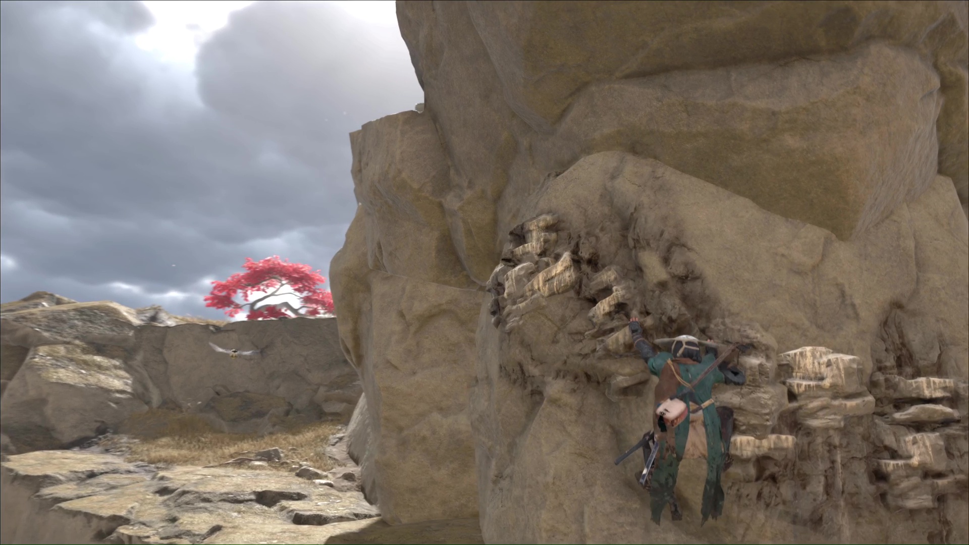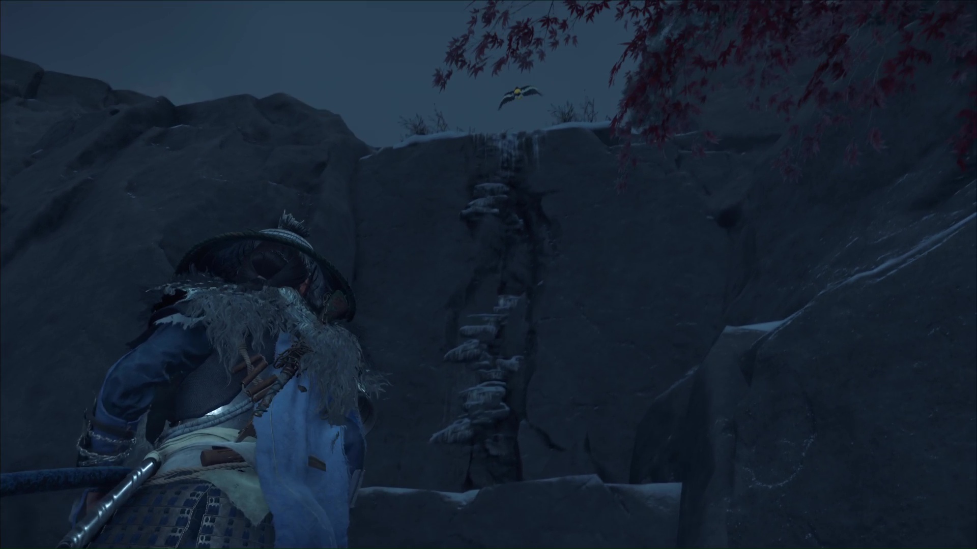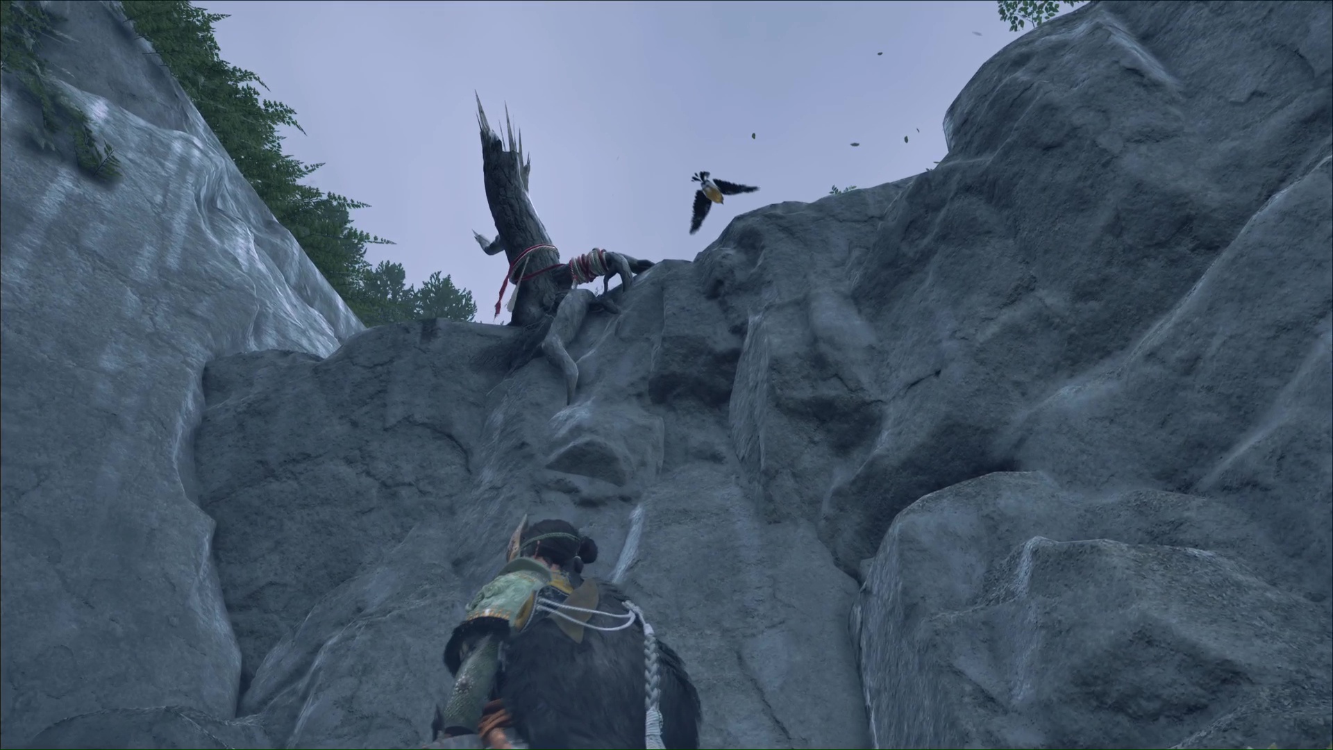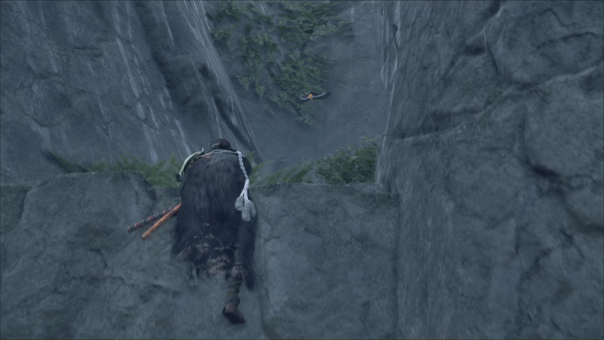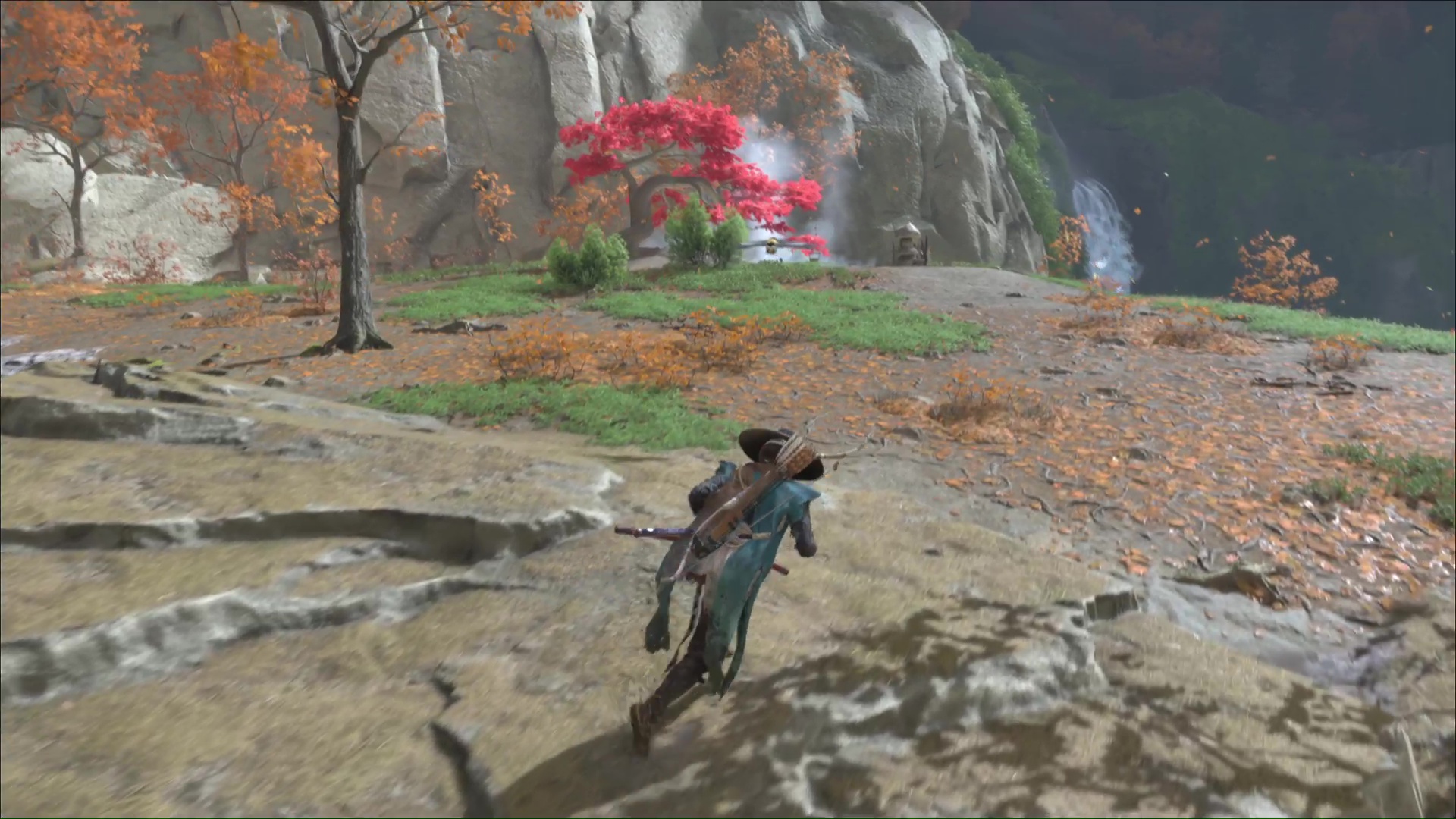 À l’extrémité nord des Prairies de Yōtei se trouve la zone des Contreforts dorés. Lorsque l’on fait face à la grande cascade, remarquez les prises rocheuses sur la gauche.