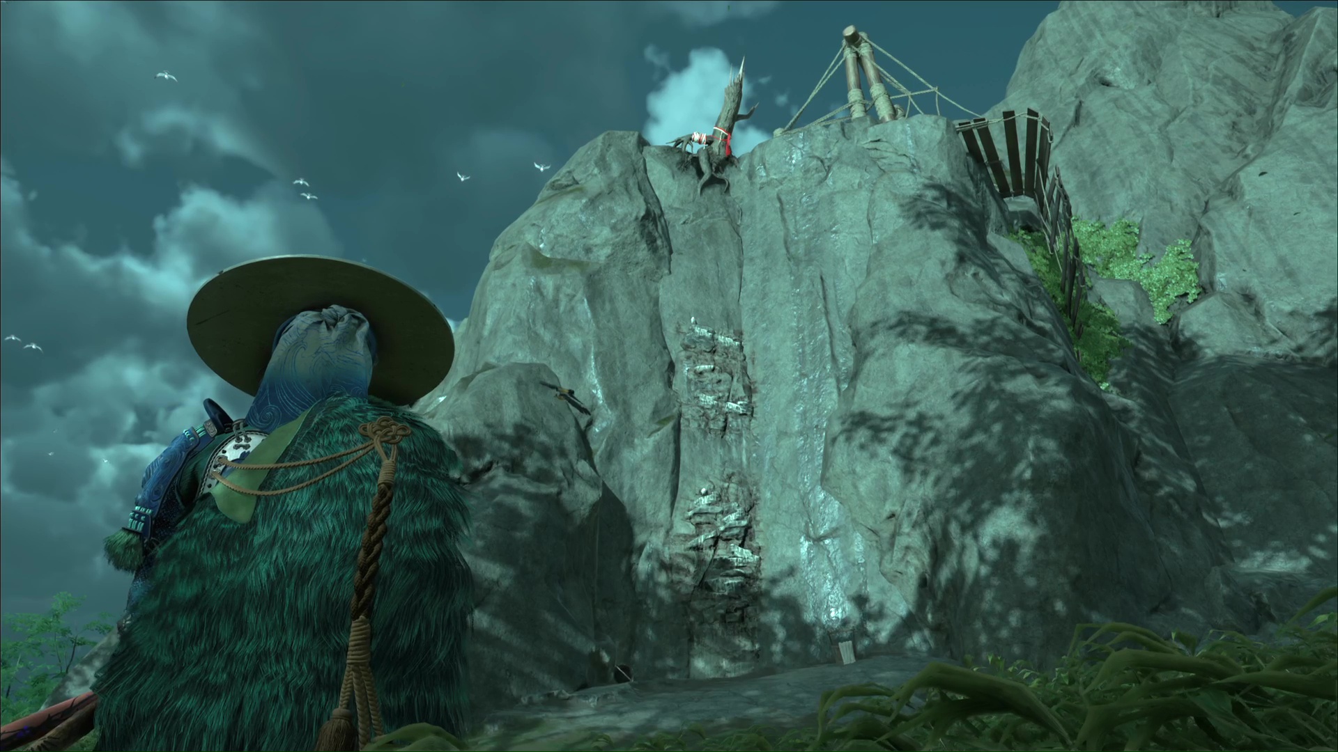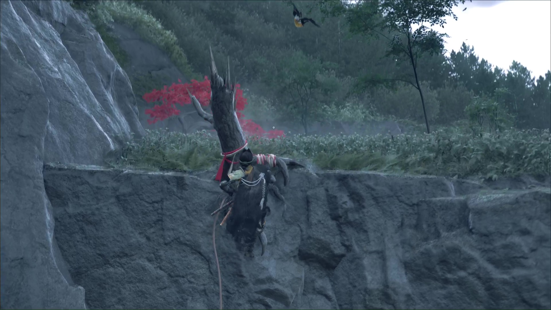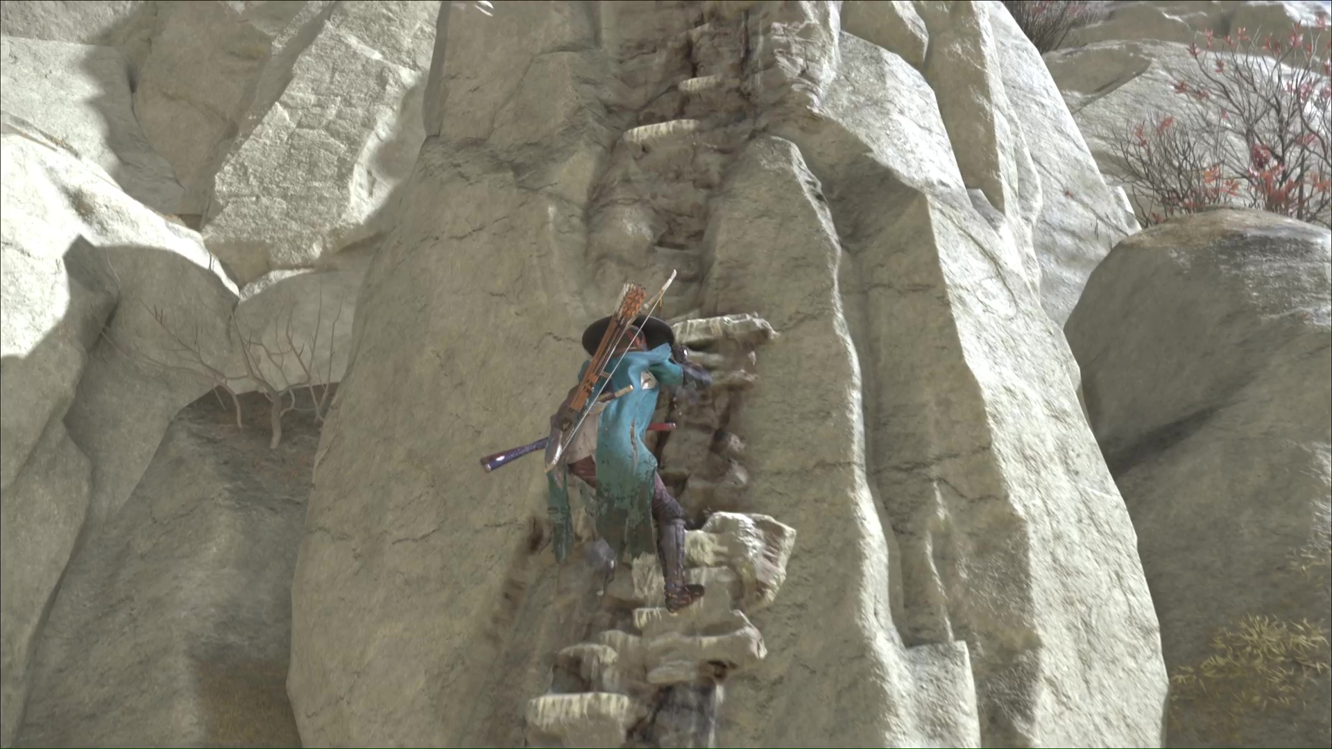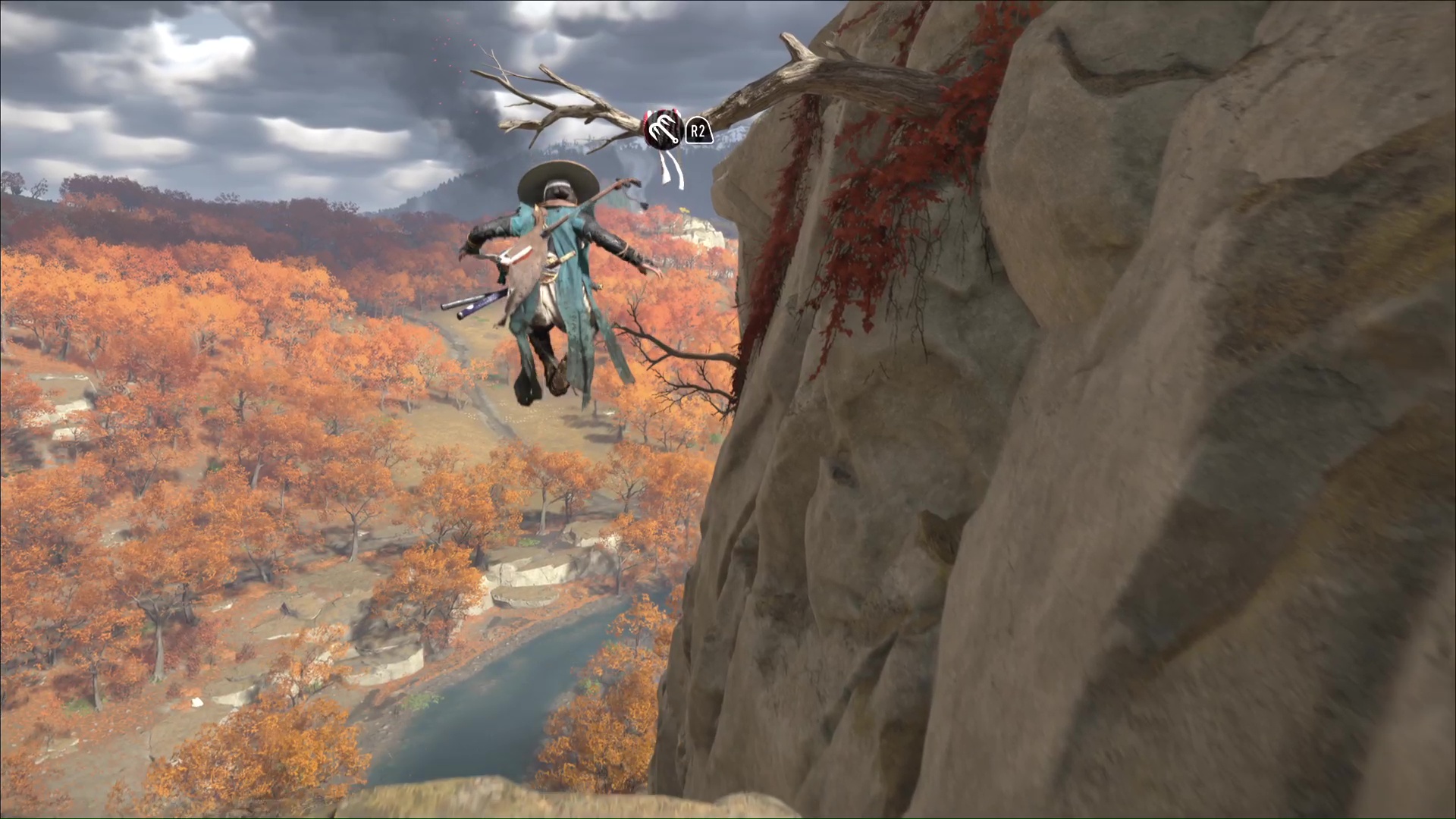 À l’extrémité nord des Prairies de Yōtei se trouve la zone des Contreforts dorés. Lorsque l’on fait face à la grande cascade, remarquez les prises rocheuses sur la gauche.