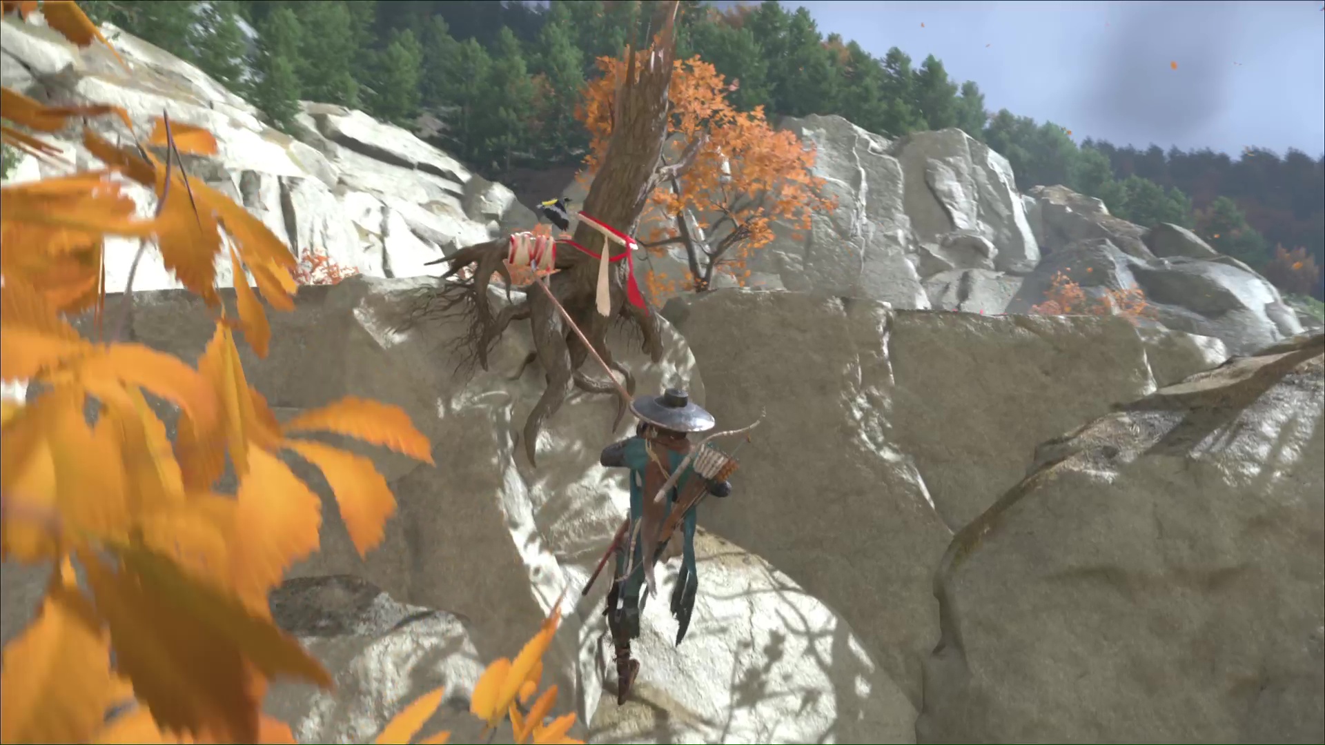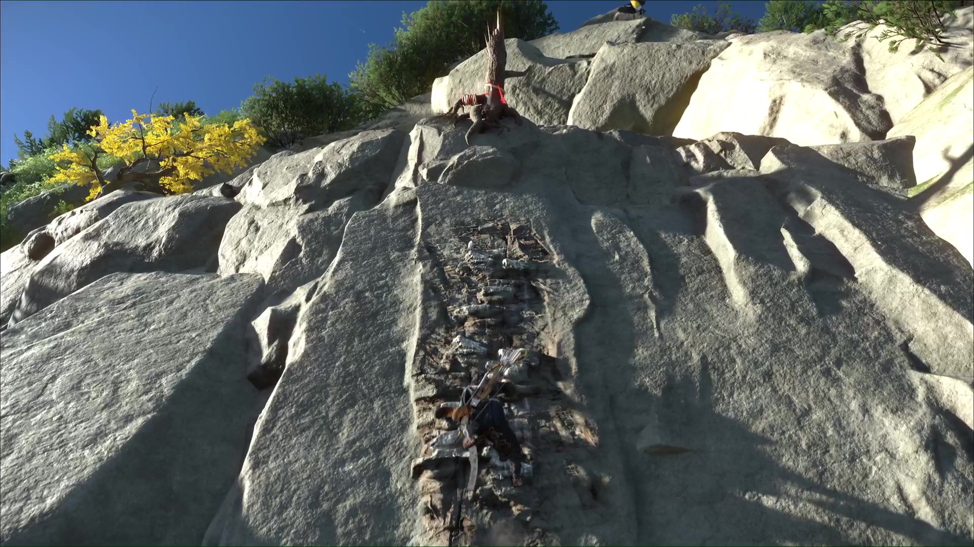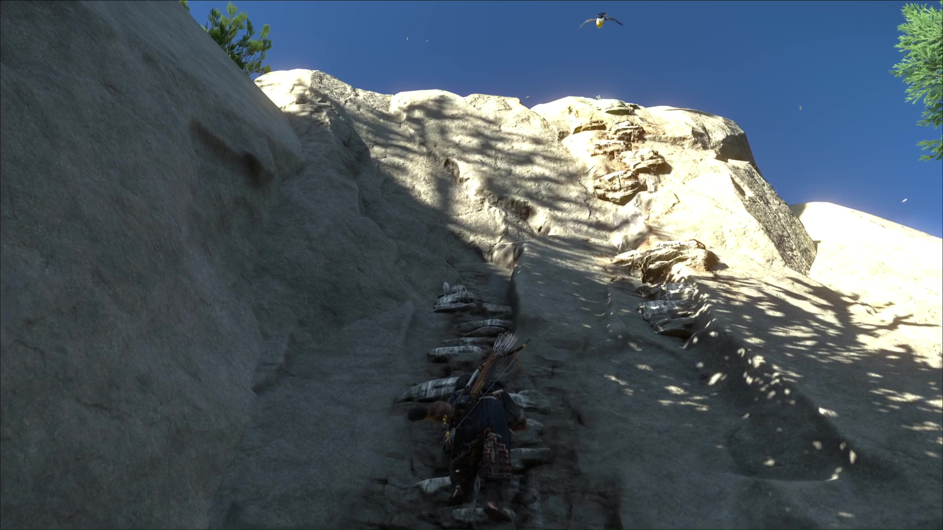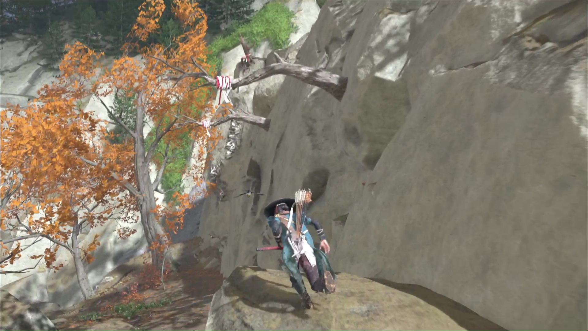 Allez-y et hissez-vous au rebord supérieur grâce à une souche. Montez ensuite les prises rocheuses devant vous pour arriver au niveau d’un tronc couché, faisant un pont vers la plateforme en face. Rejoignez-la et, sur la gauche, vous verrez d’autres prises rocheuses au bout desquelles vous devrez accrocher votre grappin à une souche pour vous hisser.