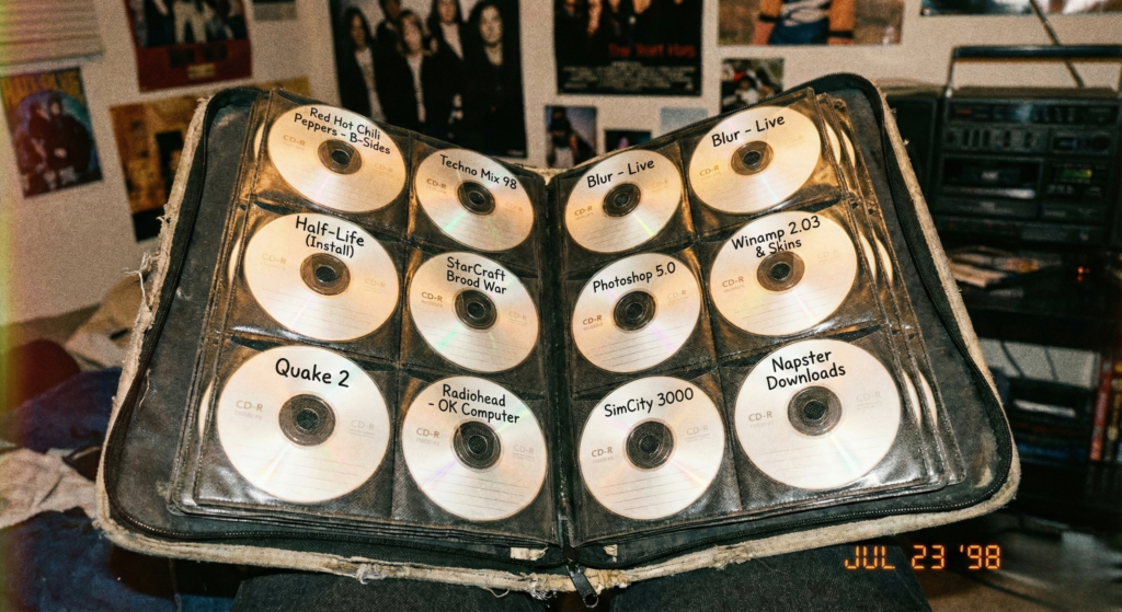 Et faut être honnête aussi, on copiait tout comme des cochons ! Les cassettes audio, évidemment, mais aussi les jeux, les trucs sur disquettes, puis plus tard les CD quand les graveurs ont commencé à débarquer chez “le pote qui a du matos”. C’était pas présenté comme de la cybercriminalité internationale comme aujourd’hui. Non, c’était juste… le quotidien. Un mélange de débrouille, de “je te prête, tu me prêtes”, et de compilation faite maison. Aujourd’hui vous payez un abonnement et vous avez tout. Avant, on avait un classeur de CD et c’était notre trésor