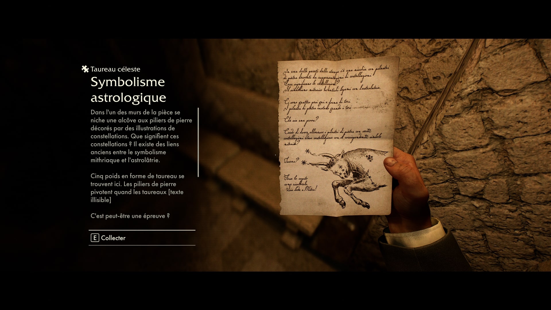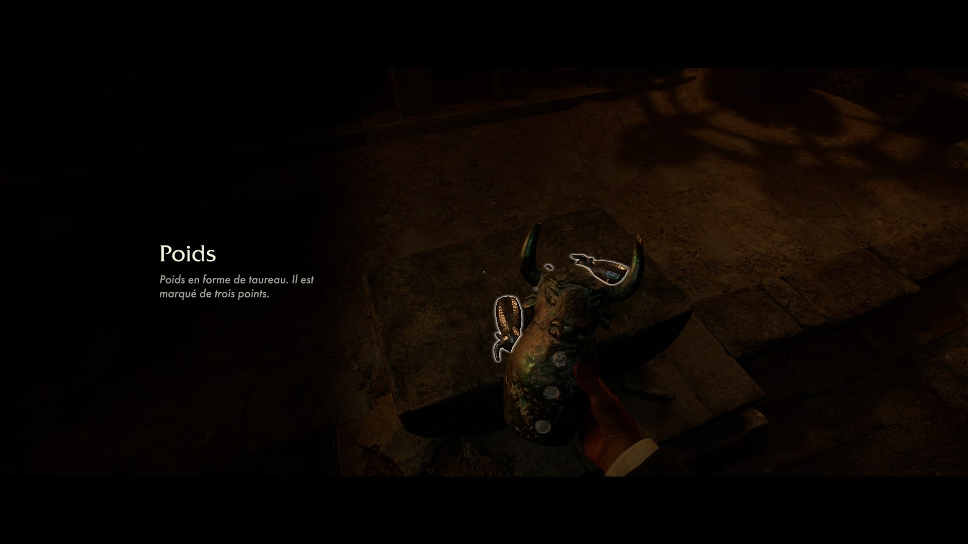 Une fois de l’autre côté, récupérez la Note de journal « Symbolisme astrologique » et remarquez la présence de cinq Poids en forme de taureau, marqués d’un ou plusieurs points dessus : 2 avec un point, 2 avec deux points et 1 seul avec trois points. Afin de reconstituer la constellation du taureau comme mentionné dans le document acquis précédemment, vous devrez les utiliser, en les plaçant dans un ordre précis sur cinq des sept espèces de plaques situées devant vous.