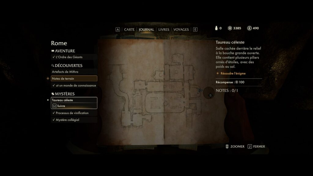 Rendez-vous dans le Mithraeum pour faire face au Mystère ‘Taureau céleste ». Après avoir récupéré la Clé du Mithraeum, vous pourrez accéder à de nouvelles zones de ce lieu, telles qu’une pièce où des adeptes du culte de Mithra prient. Débarrassez-vous d’eux et approchez-vous de la gravure centrale dont la bouche est grande ouverte. Qu’une instruction s’affiche ou non à l’écran, interagissez avec de façon à ce qu’Indy mette sa main dedans pour actionner un mécanisme. Une porte s’ouvrira alors légèrement, vous permettant ainsi de vous rendre dans la salle secrète accueillant l’énigme à résoudre ici.