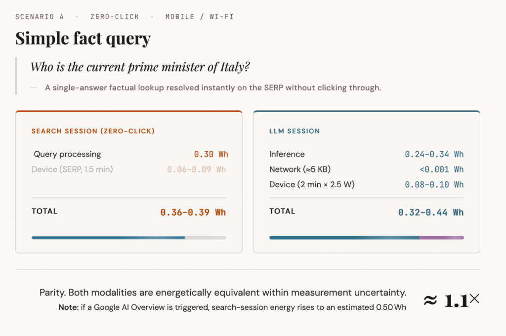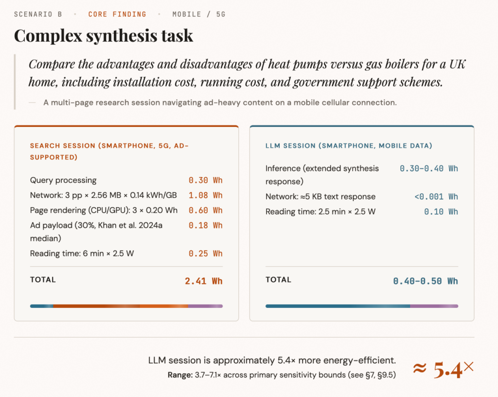 Du coup, le chercheur a modélisé la comparaison au niveau de la session utilisateur complète. Donc pas juste la requête serveur, mais tout le trajet : réseau mobile, rendu de page, pubs, temps passé à lire. Et là, les résultats sont contre-intuitifs car pour une tâche complexe sur mobile (genre comparer des pompes à chaleur et des chaudières gaz), une session LLM consommerait environ 5,4 fois moins d’énergie qu’une session de recherche web classique. Dans le pire des cas modélisé, l’avantage reste quand même de 1,6 fois.