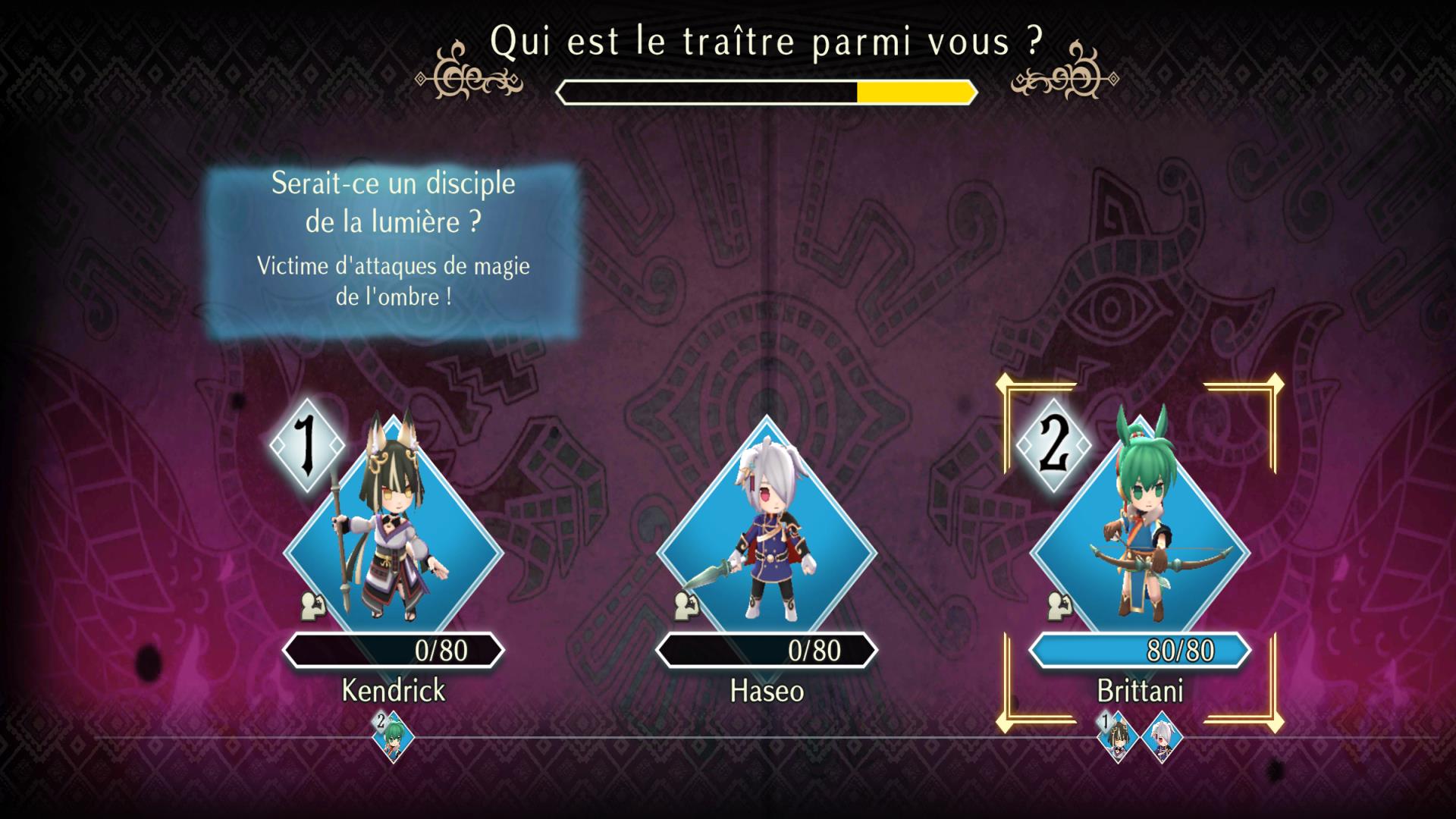 Après le premier affrontement, un vote a lieu pour désigner le suspect. L’issue de ce scrutin influence directement la difficulté ou les conditions du combat suivant, rendant chaque décision cruciale pour la progression. Avant chaque bataille, les joueurs sélectionnent armes et compétences magiques, tandis que les objets récupérés peuvent être achetés, vendus ou échangés avec les autres contre de l’or.