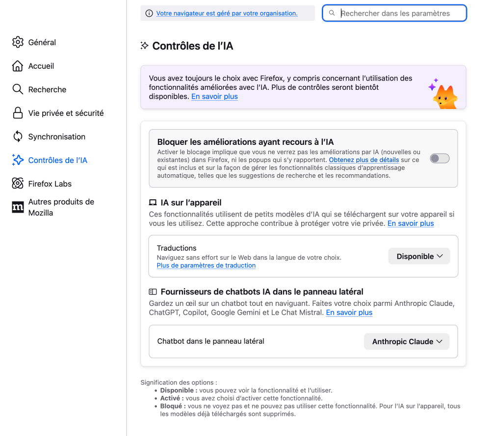 et le gros morceau, c’est la section “Contrôles de l’IA” dans les paramètres (about:preferences#ai). Un seul toggle “