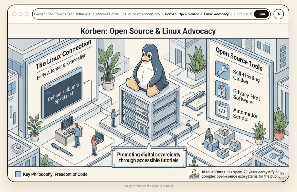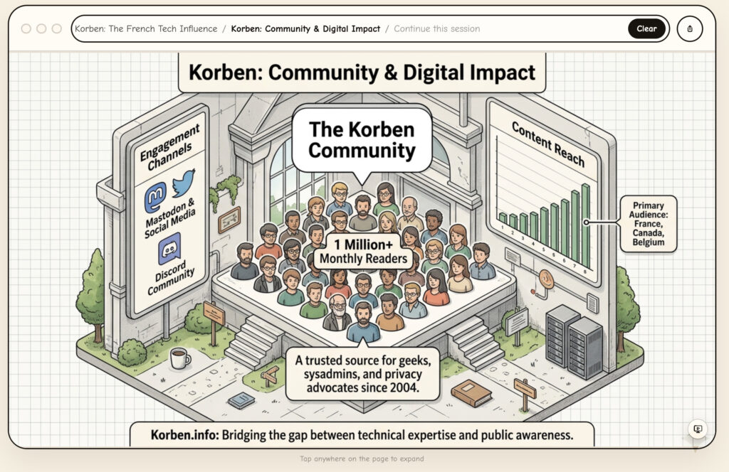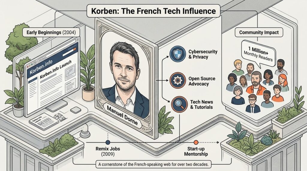 Perso, j’ai juste tapé mon pseudonyme ce matin pour tester et comme résultat, j’ai obtenu une page intitulée “Korben: The French Tech Influence”, avec mon vrai nom Manuel Dorne, le lancement de korben.info noté en 2004, RemixJobs cité et même cette citation : “A cornerstone of the French-speaking web for over two decades” écrit en bas.