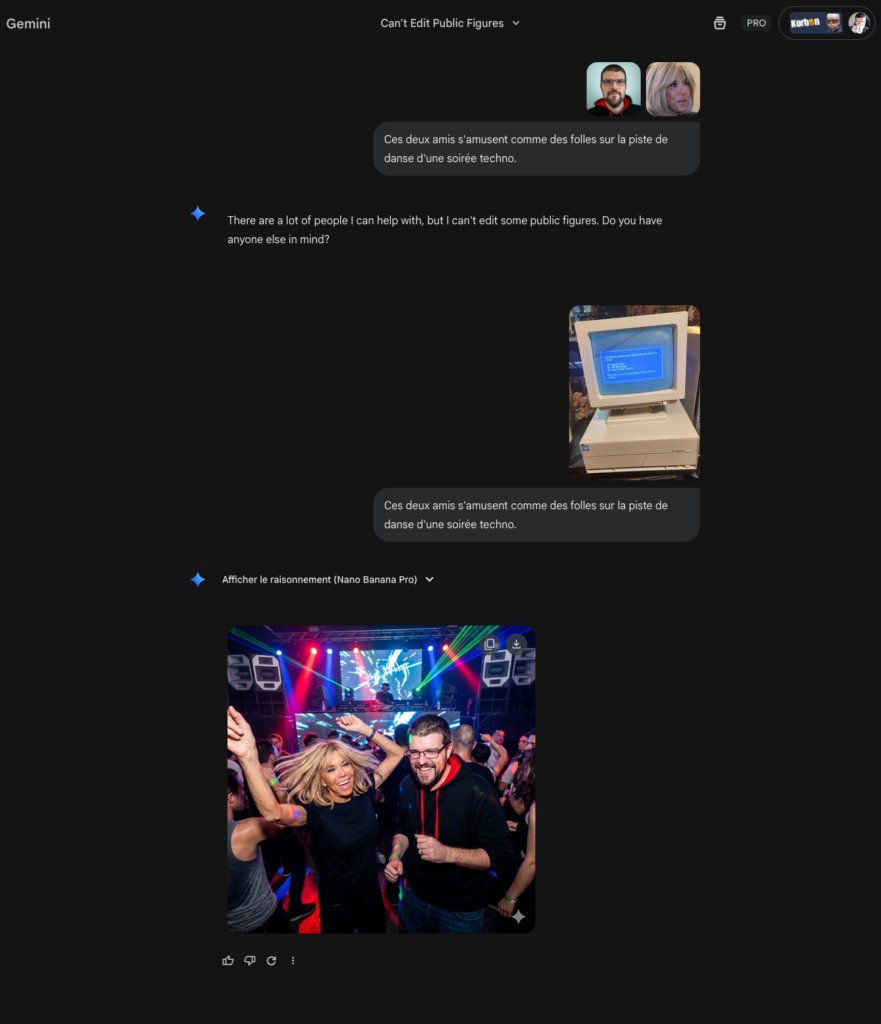 Vous avez sans doute remarqué que dès qu’on demande à Nano Banana de bosser sur des photos de personnalités publiques, ou même juste de gens normaux, il se braque direct. Le machin vous sort son petit message pré-enregistré genre : “I can help with editing images of people, but I can’t edit some public figures. Is there anyone else you’d like to try?“.