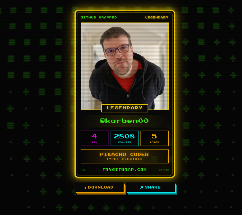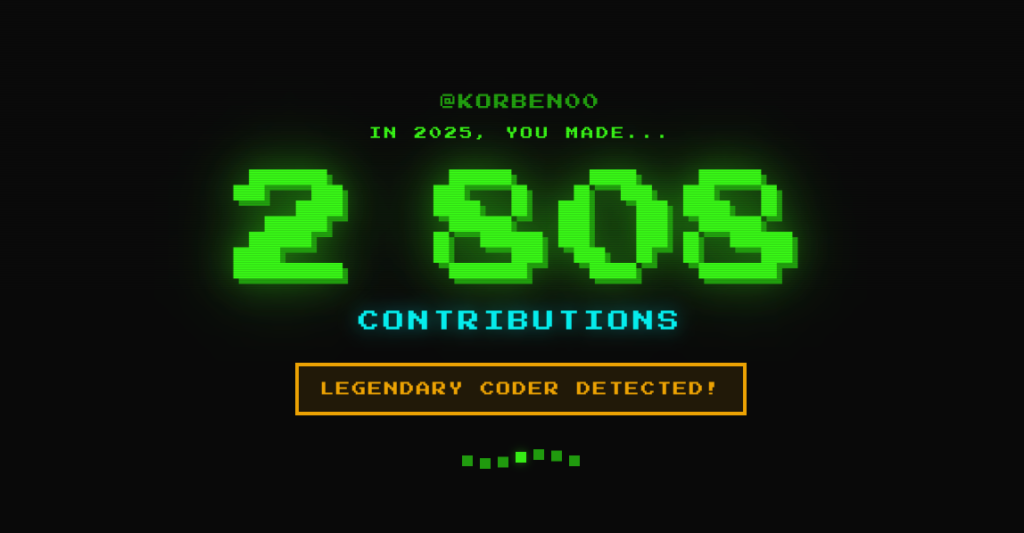 Vous entrez votre nom d’utilisateur GitHub, et l’outil génère alors un récapitulatif de votre année de commits, de pull requests et de contributions diverses et variées. Le tout emballé dans une esthétique rétro qui ferait pleurer de nostalgie n’importe quel dev qui a connu l’époque où “git” n’existait pas encore et où on faisait des sauvegardes sur disquettes.