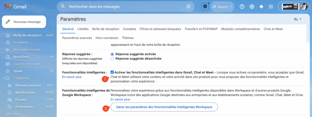Ensuite, pour être vraiment tranquille, il faut aussi aller dans les paramètres Google Workspace, et désactivez les toggles “Fonctionnalités intelligentes dans Google Workspace” et les “Fonctionnalités intelligentes dans d’autres produits Google”. (ça dépend si vous avez un Gmail Workspace ou classique)