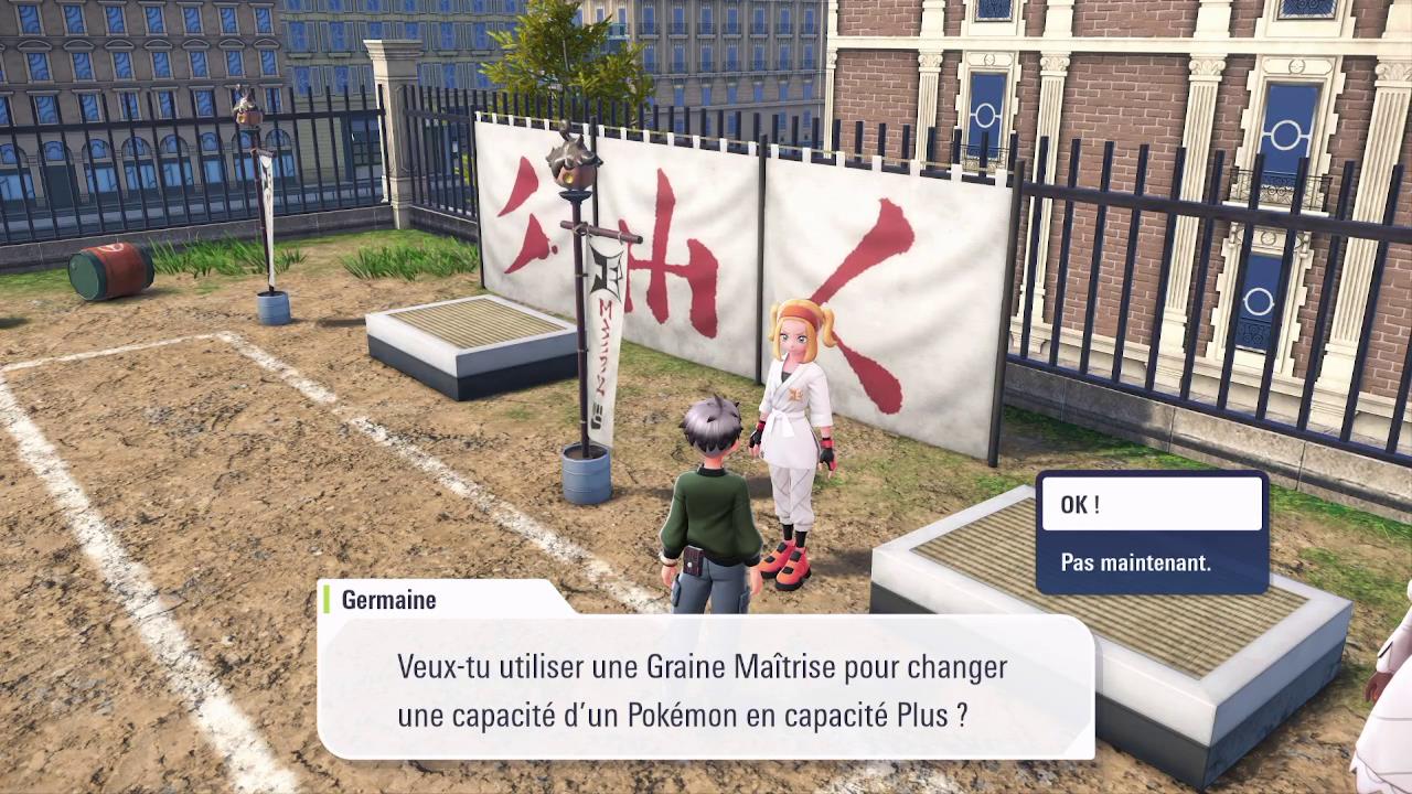 Avant de pouvoir utiliser une Graine de Maîtrise, il faut d’abord avoir atteint un certain stade de l’histoire, notamment la Mission Principale 9 « A la poursuite d’un Pokémon mystérieux ». Ensuite, rendez-vous dans le Dojo de la Justice et parlez à la disciple (celle que vous affrontez dans le scénario).