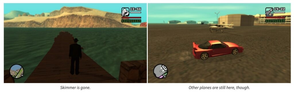 , a publié une analyse technique sur ce bug zombie. En gros, quand vous essayez de spawn le Skimmer sur Windows 11 24H2, l’hydravion devient tellement gigantesque qu’il n’est même plus rendu à l’écran. Et si vous forcez CJ à monter dedans via la console, son altitude affichée explose à environ 1,087 quadrillion d’années-lumière. Beaucoup plus loin que n’importe quoi dans l’univers observable…